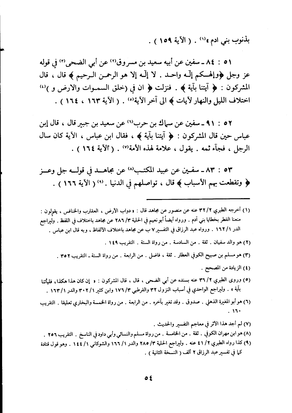 52: 91 - سفيان عَنْ سِمَاكِ بْنِ حَرْبٍ عَنْ سَعِيدِ بْنِ جُبَيْرٍ قَالَ قَالَ ابْنُ عَبَّاسٍ حِينَ قَالَ الْمُشْرِكُونَ بِآيَةٍ فَقَالَ ابْنُ عَبَّاسٍ الْآيَةُ كَانَ سَأَلَ الرَّجُلُ فَجَاءَ ثَمَّةَ يقول علامة لهذه الأمة (الآية 164) .
