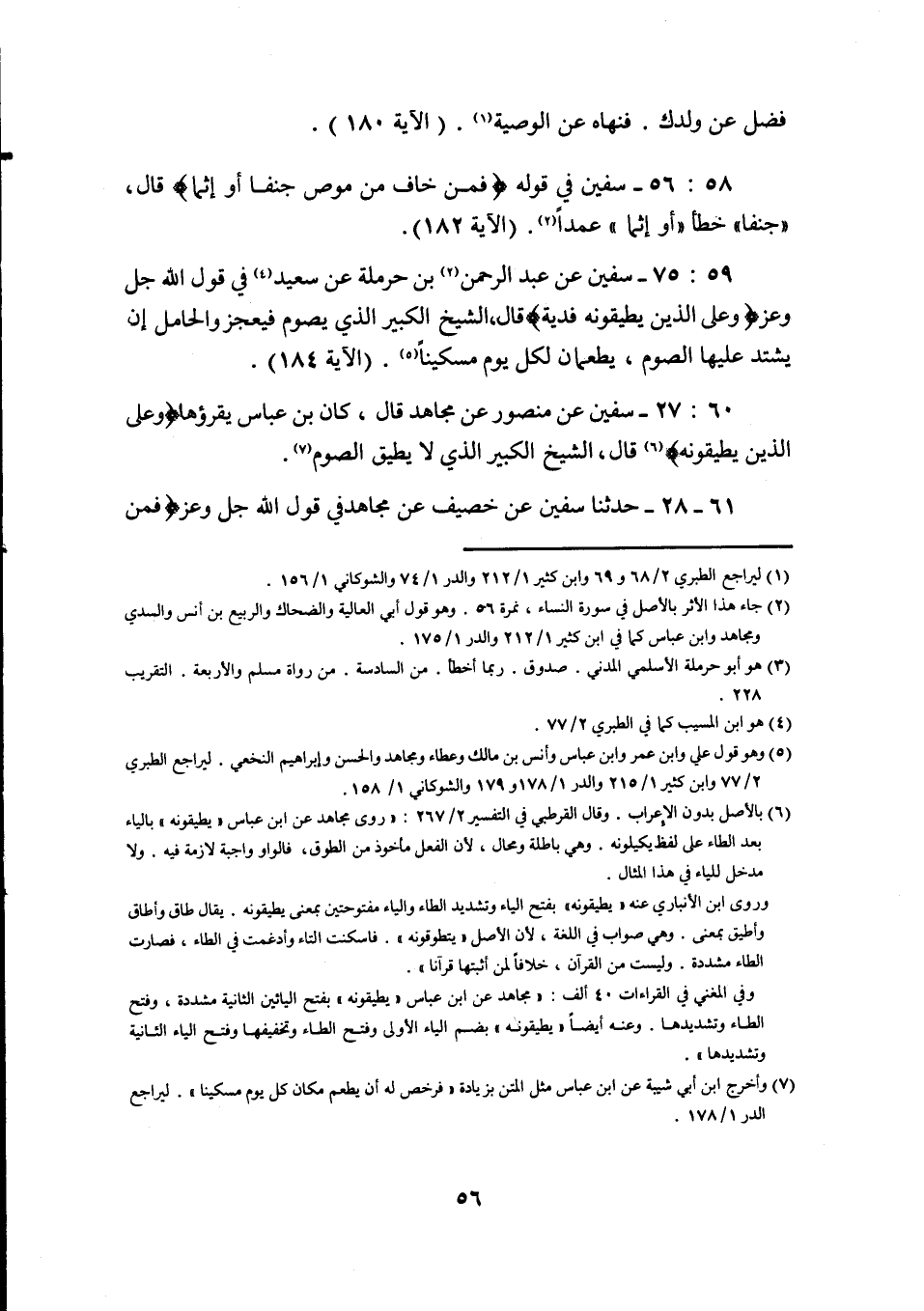 60: 27 سفيان عَنْ مَنْصُورٍ عَنْ مُجَاهِدٍ قَالَ كَانَ ابْنُ عَبَّاسٍ يَقْرَؤُهَا وَعَلَى الذين يطيقونه قَالَ الشَّيْخُ الْكَبِيرُ الَّذِي لَا يطيق الصوم 61: 28 حدثنا سفيان عَنْ خُصَيْفٍ عَنْ مُجَاهِدٍ فِي قَوْلِ اللَّهِ جَلَّ وَعَزَّ فَمَنْ