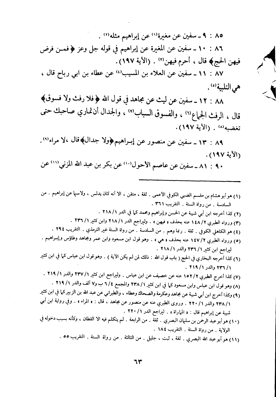 85: 9 سفيان عَنْ مُغِيرَةَ عَنْ إِبْرَاهِيمَ مِثْلِهِ 86: 10 سفيان عَنِ الْمُغِيرَةِ عَنْ إِبْرَاهِيمَ فِي قَوْلِهِ جَلَّ وَعَزّ فَمَنْ فَرَضَ فيهن الحج قال أحرم فيهن (الآية 197) .