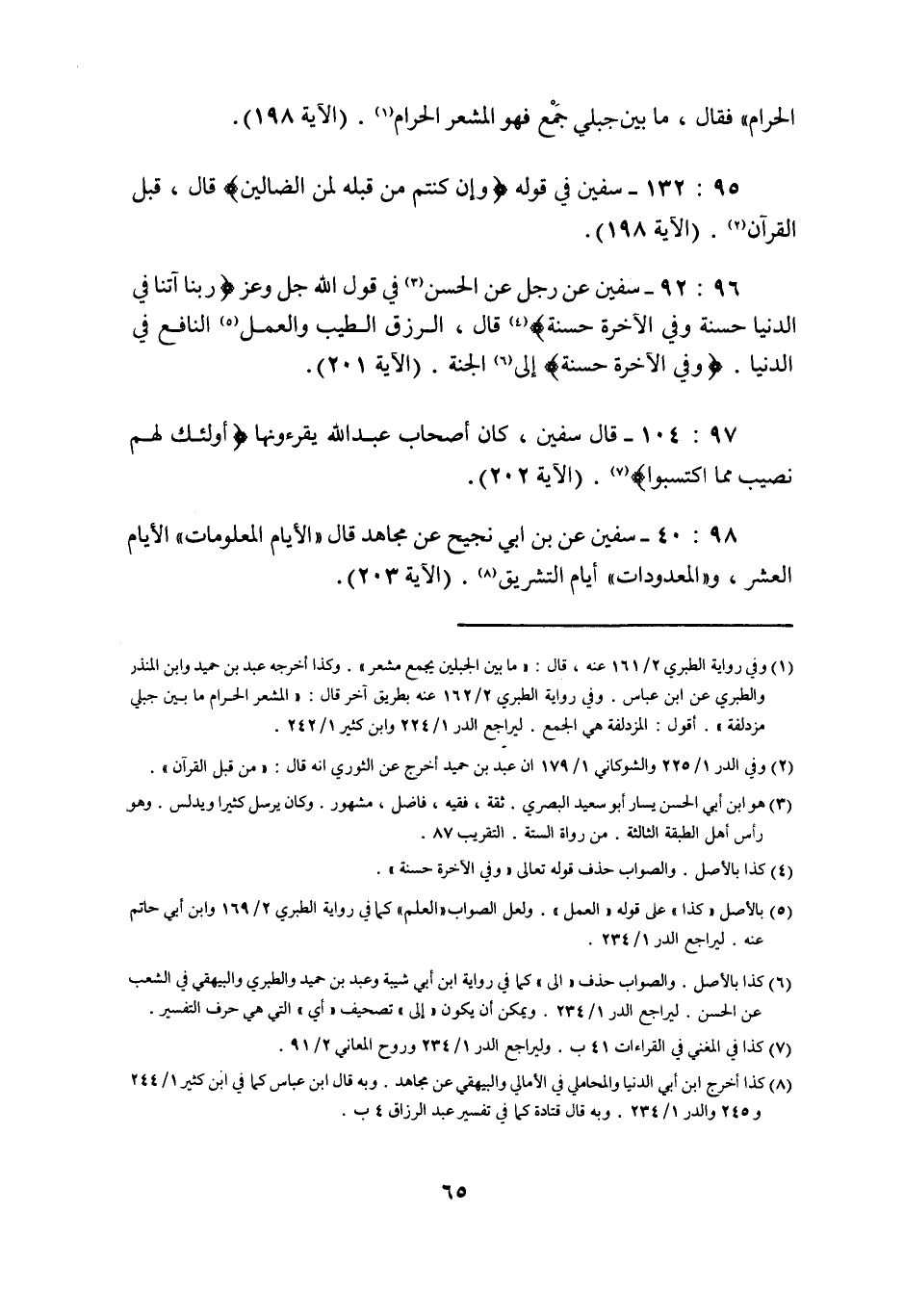 96: 92 سفيان عَنْ رَجُلٍ عَنِ الْحَسَنِ فِي قول الله جل وعز آتِنَا فِي الدُّنْيَا حَسَنَةً وَفِي الآخرة حسنة قَالَ الرِّزْقُ الطَّيِّبُ وَالْعَمَلُ النَّافِعُ فِي الدُّنْيَا وَفِي الآخِرَةِ حَسَنَةً إلى الجنة (الآية 201) .