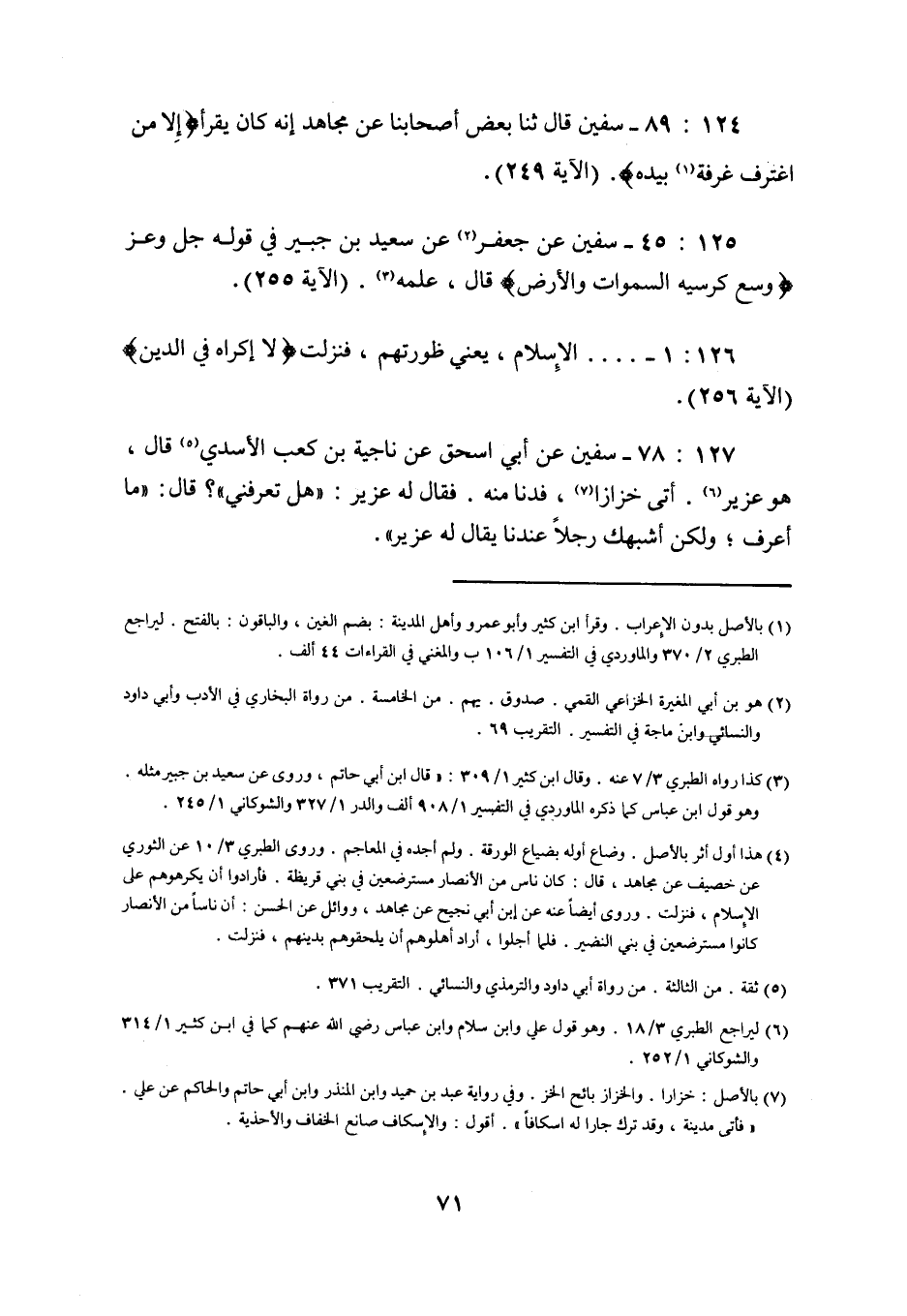 124: 89 سفيان قال ثَنَا بَعْضُ أَصْحَابِنَا عَنْ مُجَاهِدٍ إِنَّهُ كَانَ يَقْرَأُ إِلا مَنِ اغترف غرفة بيده (الآية 249) .