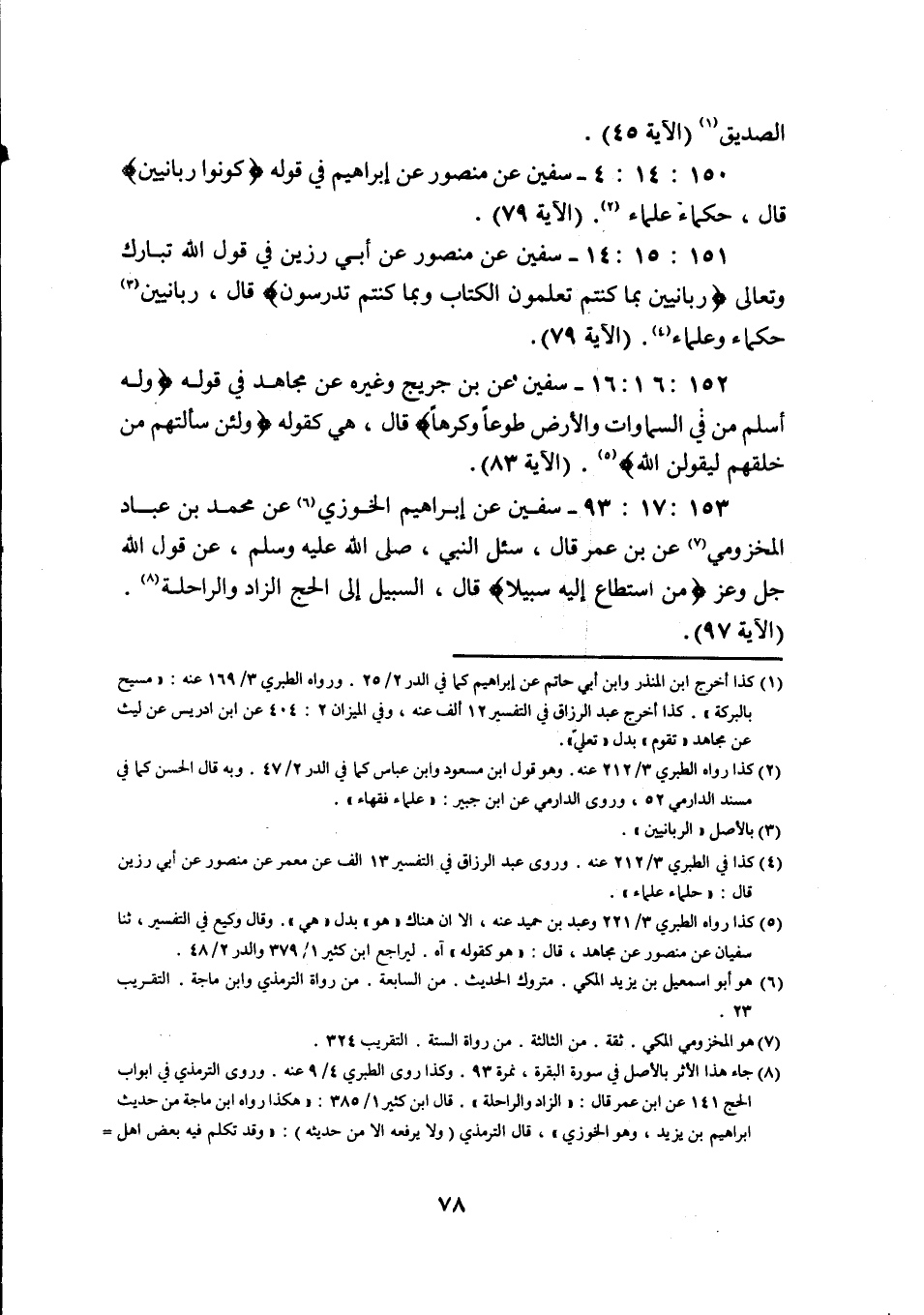 151: 15: 14 سفيان عَنْ مَنْصُورٍ عَنْ أَبِي رُزَيْنٍ فِي قَوْلِ اللَّهِ تَبَارَكَ وَتَعَالَى رَبَّانِيِّينَ بِمَا كُنْتُمْ تُعَلِّمُونَ الْكِتَابَ وبما كنتم تدرسون قال ربانيين حكماء علماء (الآية 79) .
