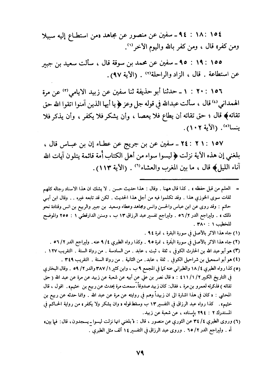 154: 18: 94 سفيان عَنْ مَنْصُورٍ عَنْ مُجَاهِدٍ مَنِ اسْتَطَاعَ إِلَيْهِ سَبِيلا وَمَنْ كَفَرَ قَالَ وَمَنْ كَفَرَ بِاللَّهِ وَالْيَوْمِ الآخر 155: 19: 95 سفيان عَنْ مُحَمَّدِ بْنِ سُوقَةَ قَالَ سَأَلْتُ سَعِيدَ بْنَ جُبَيْرٍ عَنِ استطاعة قال الزاد والراحلة (الآية 97) .