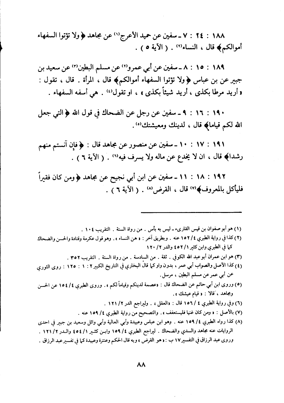 188: 24: 7 سفيان عَنْ حُمَيْدٍ الْأَعْرَجِ عَنْ مُجَاهِدٍ ولا تؤتوا السفهاء أموالكم قال النساء الآية 5) .