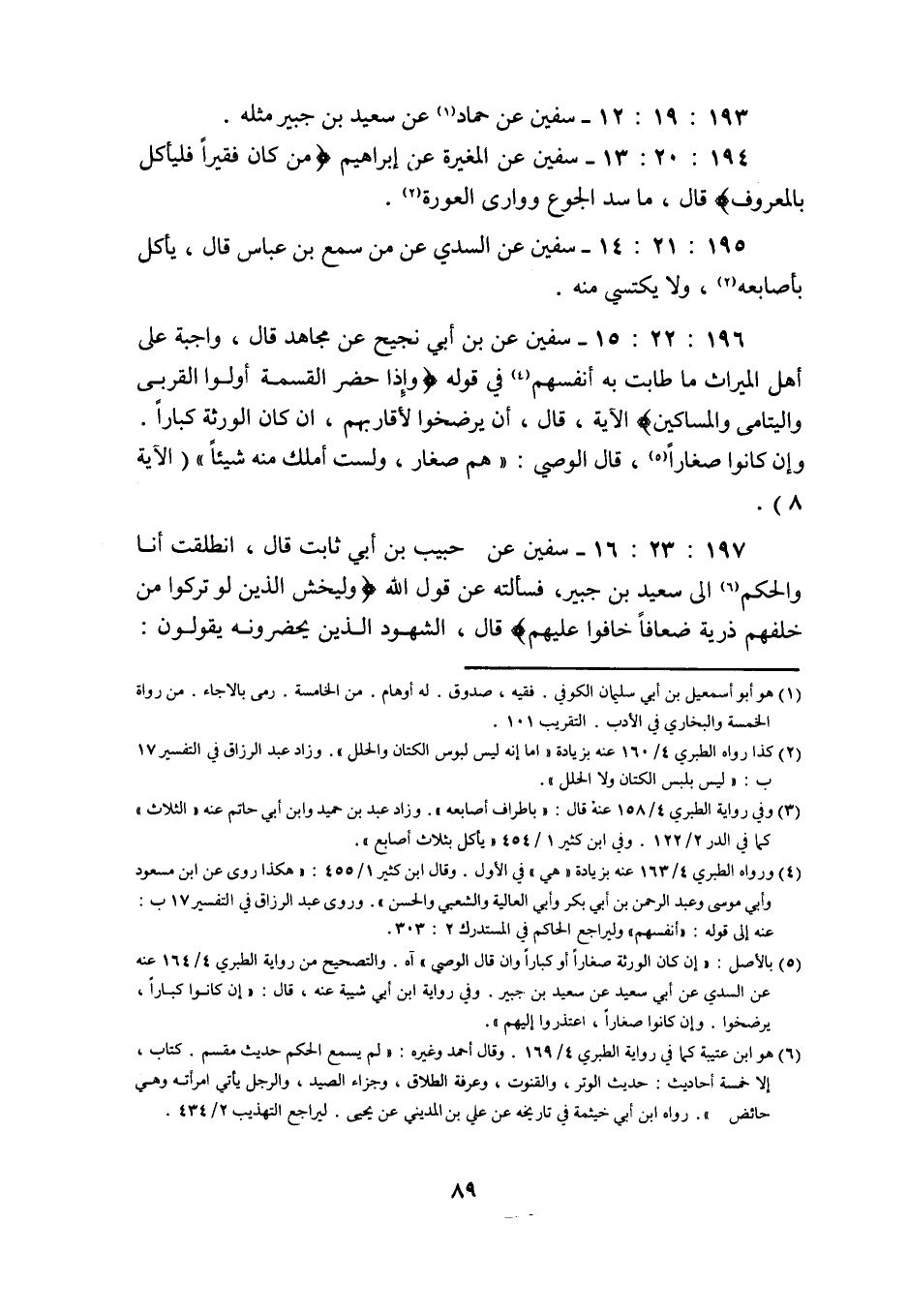 193: 19: 12 سفيان عَنْ حَمَّادٍ عَنْ سَعِيدِ بْنِ جبير مثله 194: 20: 13 سفيان عن المغيرة عن إبراهيم من كان فقيرا فليأكل بالمعروف قَالَ مَا سَدَّ الْجُوعَ وَوَارَى العورة.