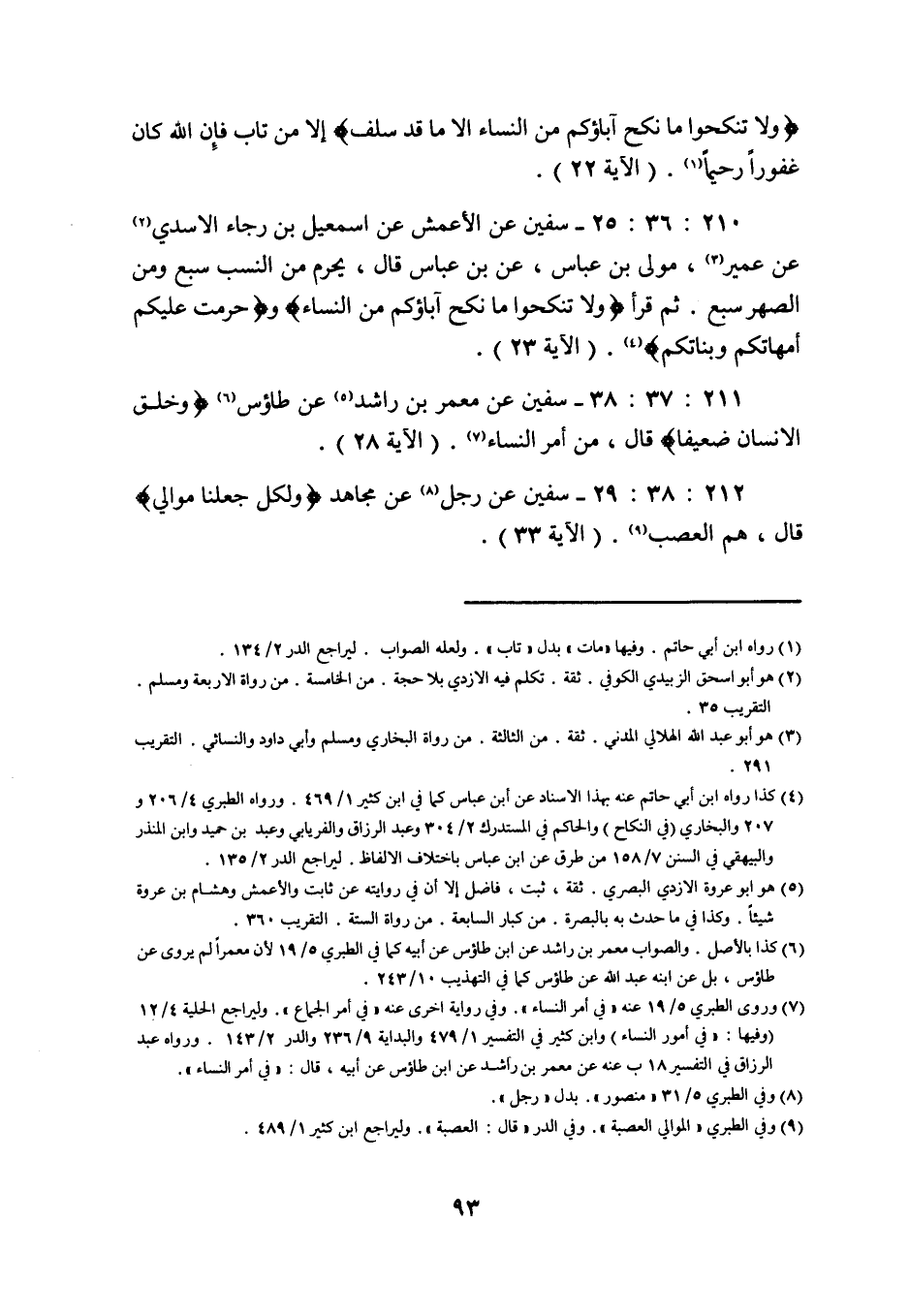 210: 36: 25 سفيان عن الأعمش عن اسمعيل بْنِ رَجَاءٍ الْأَسَدِيِّ عَنْ عُمَيْرٍ مولى بن عباس عن بن عَبَّاسٍ قَالَ يَحْرُمُ مِنَ النَّسَبِ سَبْعٌ وَمِنَ الصِّهْرِ سَبْعٌ ثُمَّ قَرَأَ وَلا تَنْكِحُوا مَا نَكَحَ آباؤكم من النساء وحرمت عليكم أمهاتكم وبناتكم (الآية 23) .
