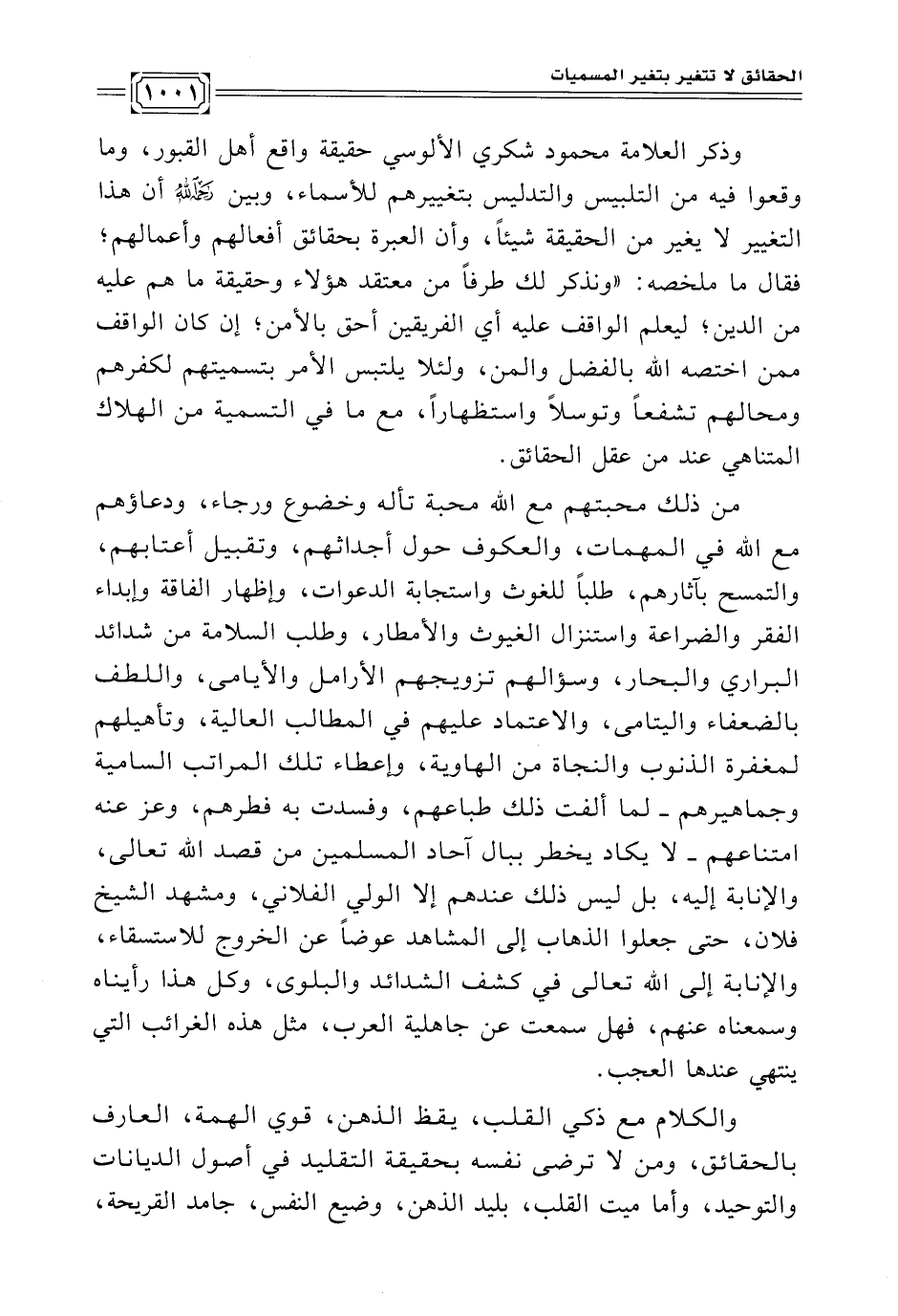 وذكر العلامة محمود شكري الألوسي حقيقة واقع أهل القبور، وما وقعوا فيه من التلبيس والتدليس بتغييرهم للأسماء، وبين رحمه الله أن هذا التغيير لا يغير من الحقيقة شيئًا، وأن العبرة بحقائق أفعالهم وأعمالهم؛ فقال ما ملخصه: "ونذكر لك طرفًا من معتقد هؤلاء وحقيقة ما هم عليه من الدين؛ ليعلم الواقف عليه أي الفريقين أحق بالأمن؛ إن كان الواقف ممن اختصه الله بالفضل والمن، ولئلا يلتبس الأمر بتسميتهم لكفرهم ومحالهم تشفعًا وتوسلًا واستظهارًا، مع ما في التسمية من الهلاك المتناهي عند من عقل الحقائق.