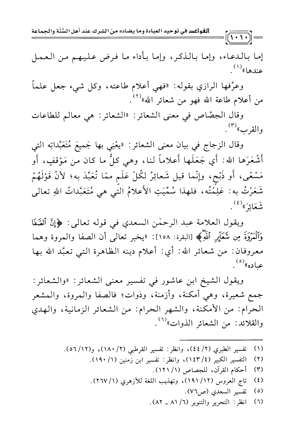 ويقول العلامة عبد الرحمن السعدي في قوله تعالى: {إِنَّ الصَّفَا وَالْمَرْوَةَ مِنْ شَعَائِرِ اللَّهِ} [البقرة: ١٥٨]: "يخبر تعالى أن الصفا والمروة وهما معروفان: من شعائر الله: أي: أعلام دينه الظاهرة التي تعبَّد الله بها عباده" (¬٥).