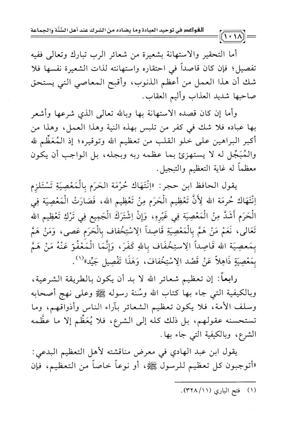 أما التحقير والاستهانة بشعيرة من شعائر الرب تبارك وتعالى ففيه تفصيل؛ فإن كان قاصدًا في احتقاره واستهانته لذات الشعيرة نفسها فلا شك أن هذا العمل من أعظم الذنوب، وأقبح المعاصي التي يستحق صاحبها شديد العذاب وأليم العقاب.