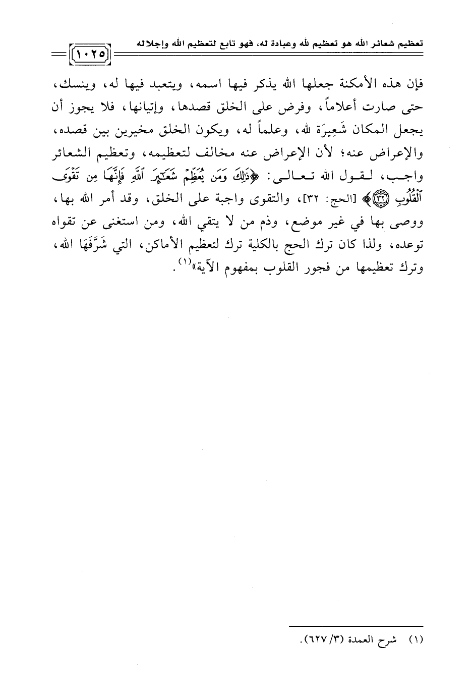 فإن هذه الأمكنة جعلها الله يذكر فيها اسمه، ويتعبد فيها له، وينسك، حتى صارت أعلامًا، وفرض على الخلق قصدها، وإتيانها، فلا يجوز أن يجعل المكان شَعِيرَة لله، وعلمًا له، ويكون الخلق مخيرين بين قصده، والإعراض عنه؛ لأن الإعراض عنه مخالف لتعظيمه، وتعظيم الشعائر واجب، لقول الله تعالى: {ذَلِكَ وَمَنْ يُعَظِّمْ شَعَائِرَ اللَّهِ فَإِنَّهَا مِنْ تَقْوَى الْقُلُوبِ} [الحج: ٣٢]، والتقوى واجبة على الخلق، وقد أمر الله بها، ووصى بها في غير موضع، وذم من لا يتقي الله، ومن استغنى عن تقواه توعده، ولذا كان ترك الحج بالكلية ترك لتعظيم الأماكن، التي شَرَّفَهَا الله، وترك تعظيمها من فجور القلوب بمفهوم الآية" (¬١).
