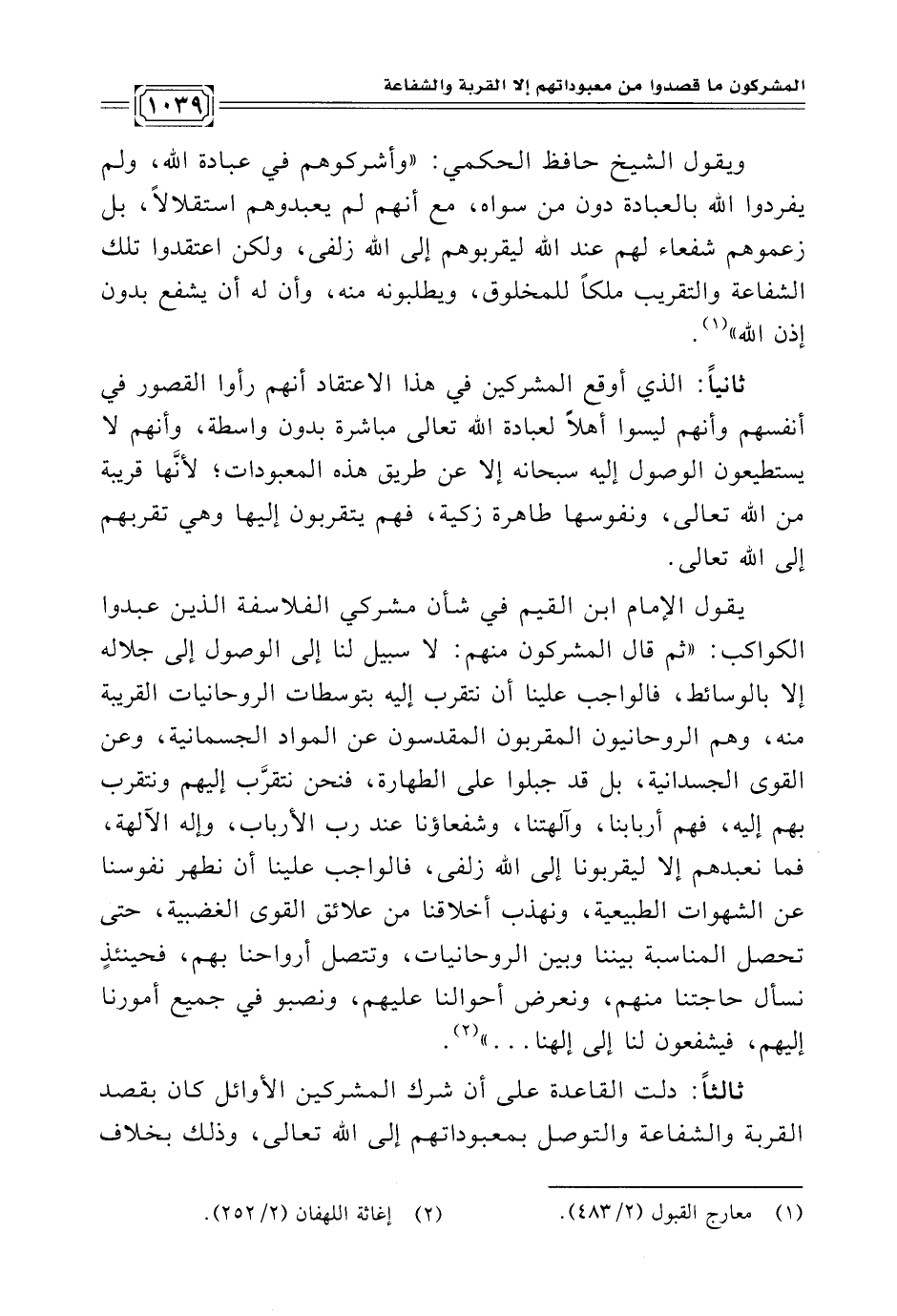 يقول الإمام ابن القيم في شأن مشركي الفلاسفة الذين عبدوا الكواكب: "ثم قال المشركون منهم: لا سبيل لنا إلى الوصول إلى جلاله إلا بالوسائط، فالواجب علينا أن نتقرب إليه بتوسطات الروحانيات القريبة منه، وهم الروحانيون المقربون المقدسون عن المواد الجسمانية، وعن القوى الجسدانية، بل قد جبلوا على الطهارة، فنحن نتقرَّب إليهم ونتقرب بهم إليه، فهم أربابنا، وآلهتنا، وشفعاؤنا عند رب الأرباب، وإله الآلهة، فما نعبدهم إلا ليقربونا إلى الله زلفى، فالواجب علينا أن نطهر نفوسنا عن الشهوات الطبيعية، ونهذب أخلاقنا من علائق القوى الغضبية، حتى تحصل المناسبة بيننا وبين الروحانيات، وتتصل أرواحنا بهم، فحينئذٍ نسأل حاجتنا منهم، ونعرض أحوالنا عليهم، ونصبو في جميع أمورنا إليهم، فيشفعون لنا إلى إلهنا ... " (¬٢).