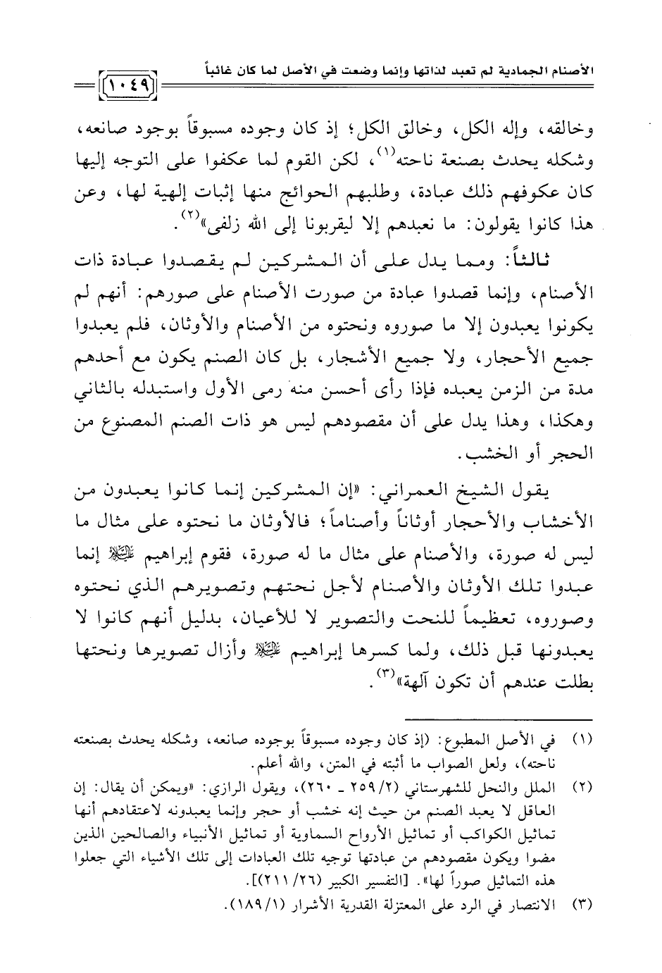 (¬٢) الملل والنحل للشهرستاني (٢/ ٢٥٩ - ٢٦٠)، ويقول الرازي: "ويمكن أن يقال: إن العاقل لا يعبد الصنم من حيث إنه خشب أو حجر وإنما يعبدونه لاعتقادهم أنها تماثيل الكواكب أو تماثيل الأرواح السماوية أو تماثيل الأنبياء والصالحين الذين مضوا ويكون مقصودهم من عبادتها توجيه تلك العبادات إلى تلك الأشياء التي جعلوا هذه التماثيل صورًا لها". [التفسير الكبير (٢٦/ ٢١١)].
