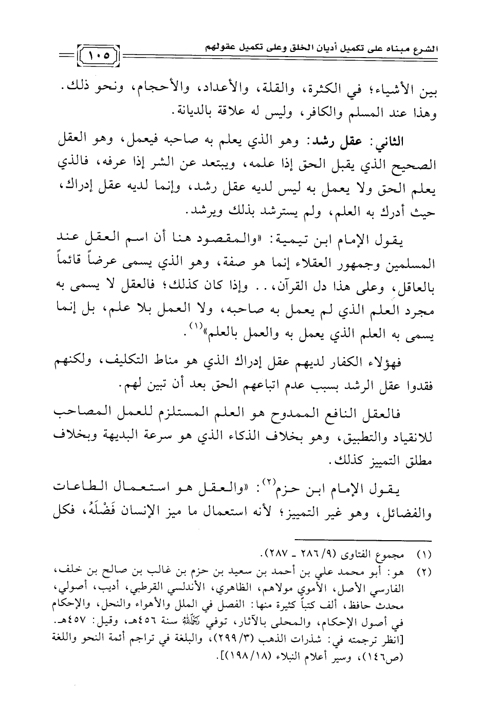يقول الإمام ابن تيمية: "والمقصود هنا أن اسم العقل عند المسلمين وجمهور العقلاء إنما هو صفة، وهو الذي يسمى عرضًا قائمًا بالعاقل، وعلى هذا دل القرآن، .. وإذا كان كذلك؛ فالعقل لا يسمى به مجرد العلم الذي لم يعمل به صاحبه، ولا العمل بلا علم، بل إنما يسمى به العلم الذي يعمل به والعمل بالعلم" (¬١).