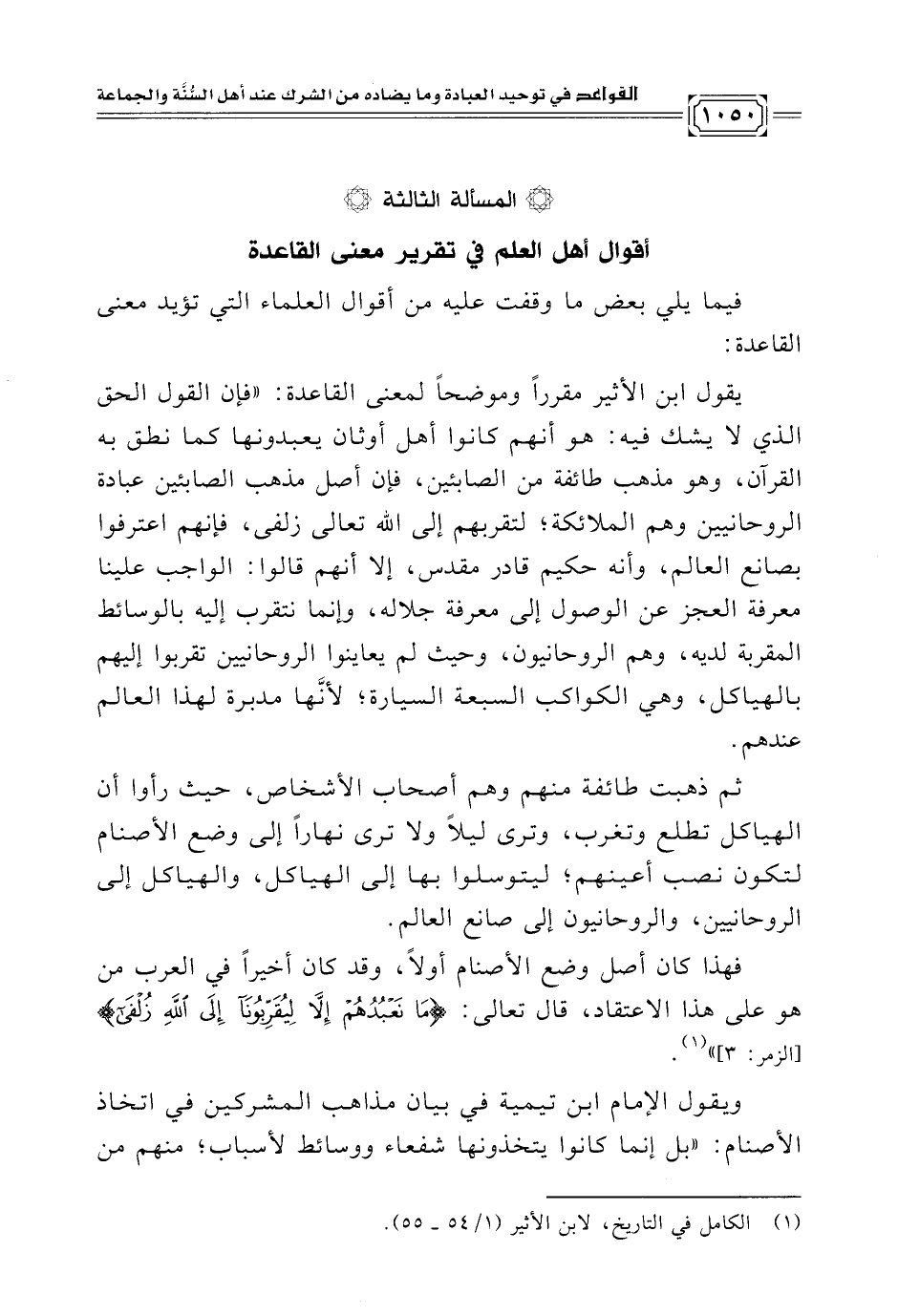 فيما يلي بعض ما وقفت عليه من أقوال العلماء التي تؤيد معنى القاعدة: يقول ابن الأثير مقررًا وموضحًا لمعنى القاعدة: "فإن القول الحق الذي لا يشك فيه: هو أنهم كانوا أهل أوثان يعبدونها كما نطق به القرآن، وهو مذهب طائفة من الصابئين، فإن أصل مذهب الصابئين عبادة الروحانيين وهم الملائكة؛ لتقربهم إلى الله تعالى زلفى، فإنهم اعترفوا بصانع العالم، وأنه حكيم قادر مقدس، إلا أنهم قالوا: الواجب علينا معرفة العجز عن الوصول إلى معرفة جلاله، وإنما نتقرب إليه بالوسائط المقربة لديه، وهم الروحانيون، وحيث لم يعاينوا الروحانيين تقربوا إليهم بالهياكل، وهي الكواكب السبعة السيارة؛ لأنَّها مدبرة لهذا العالم عندهم.