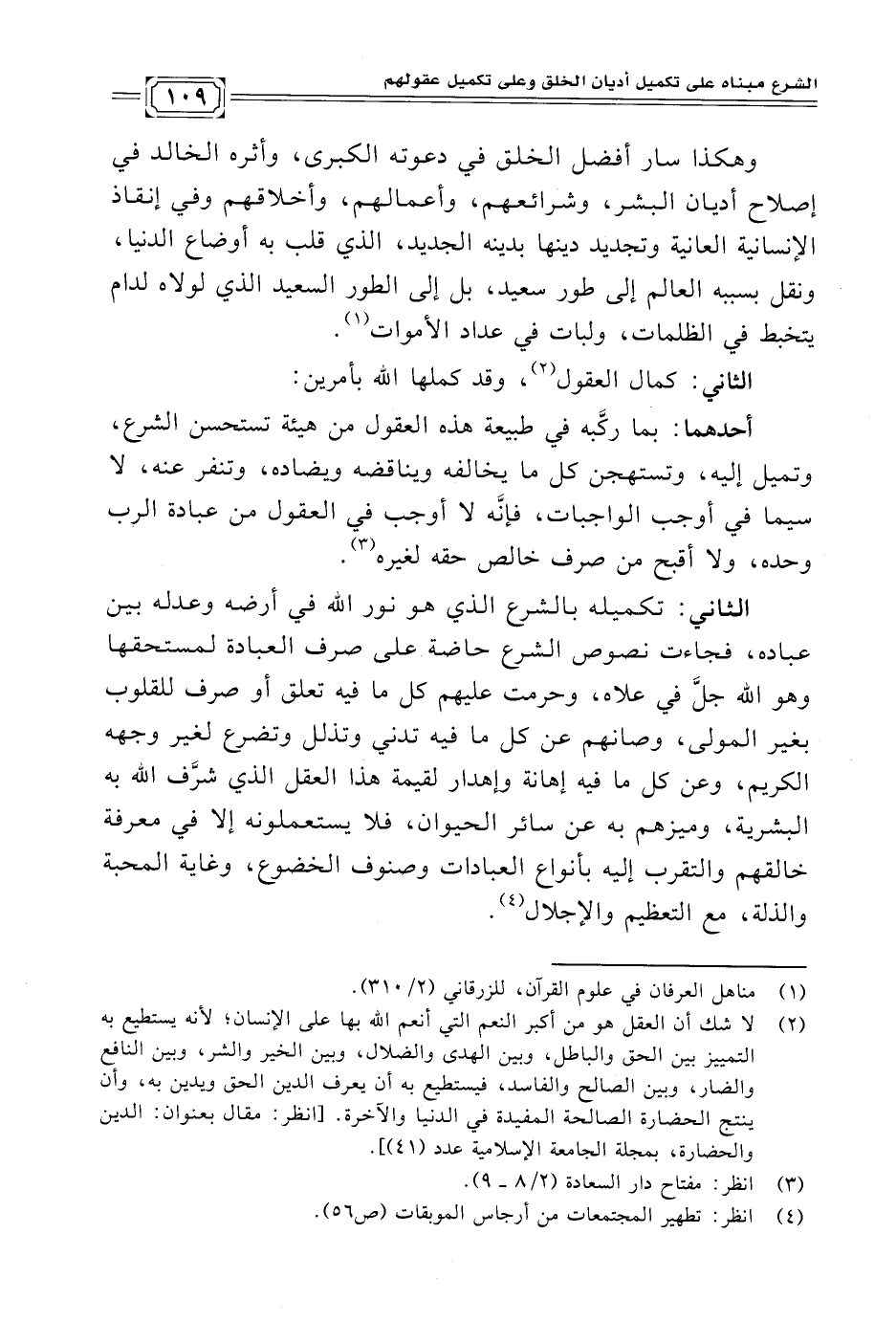 (¬٢) لا شكَّ أن العقل هو من أكبر النعم التي أنعم اللَّه بها على الإنسان، لأنَّهُ يستطيع به التمييز بين الحق والباطل، وبين الهدى والضلال، وبين الخير والشر، وبين النافع والضار، وبين الصالح والفاسد، فيستطيع به أن يعرف الدين الحق ويدين به، وأن ينتج الحضارة الصالحة المفيدة في الدنيا والآخرة. [انظر: مقال بعنوان: الدين والحضارة، بمجلة الجامعة الإسلامية عدد (٤١)].
