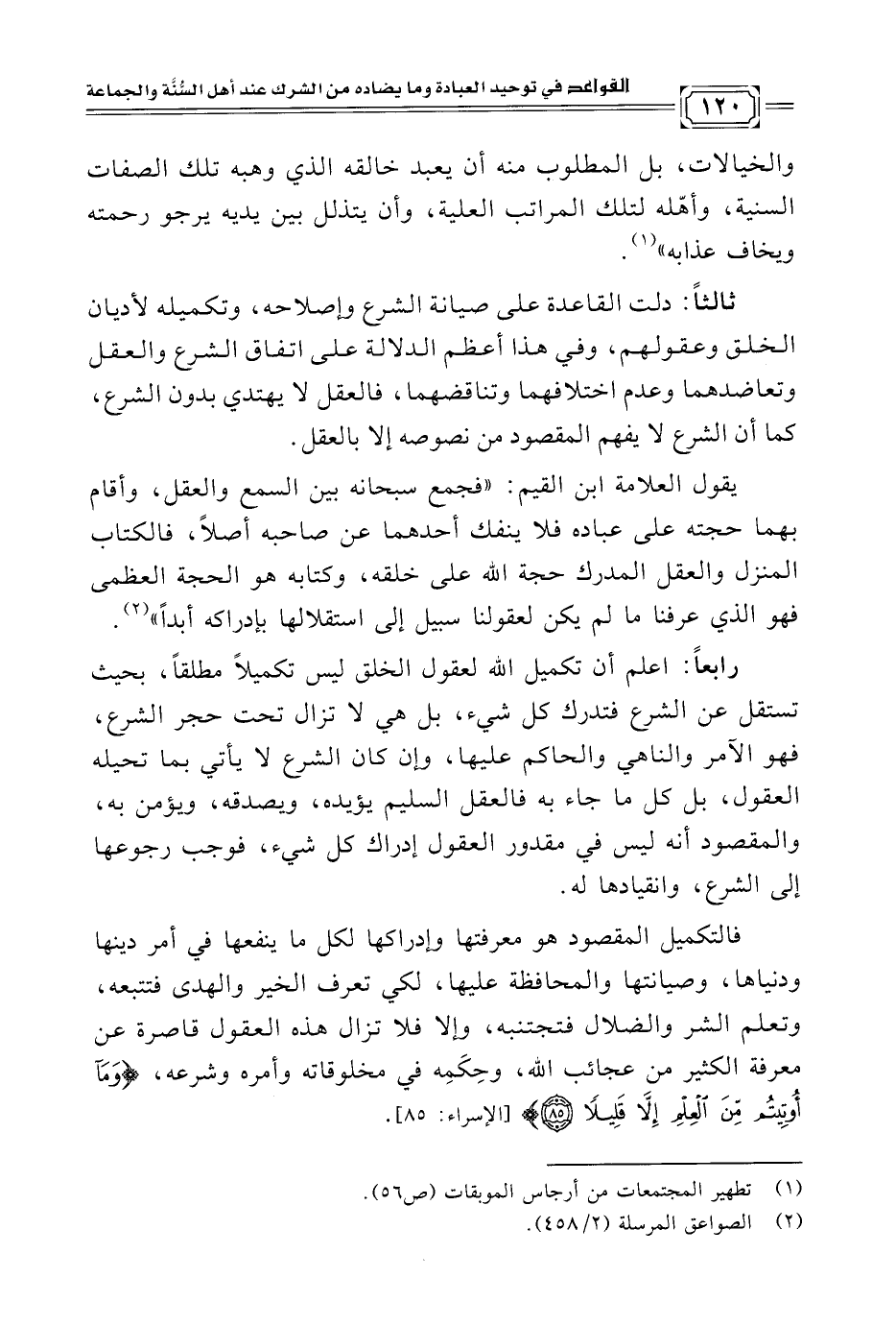 رابعًا: اعلم أن تكميل اللَّه لعقول الخلق ليس تكميلًا مطلقًا، بحيث تستقل عن الشرع فتدرك كل شيء، بل هي لا تزال تحت حجر الشرع، فهو الآمر والناهي والحاكم عليها، وإن كان الشرع لا يأتي بما تحيله العقول، بل كل ما جاء به فالعقل السليم يؤيده، ويصدقه، ويؤمن به، والمقصود أنه ليس في مقدور العقول إدراك كل شيء، فوجب رجوعها إلى الشرع، وانقيادها له.