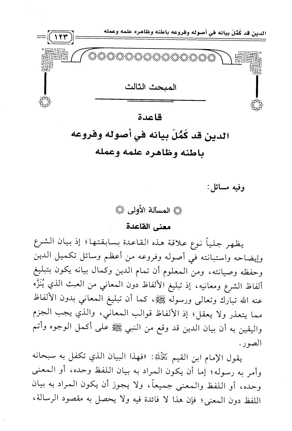 الدين قد كَمُلَ بيانه في أصوله وفروعه باطنه وظاهره علمه وعمله