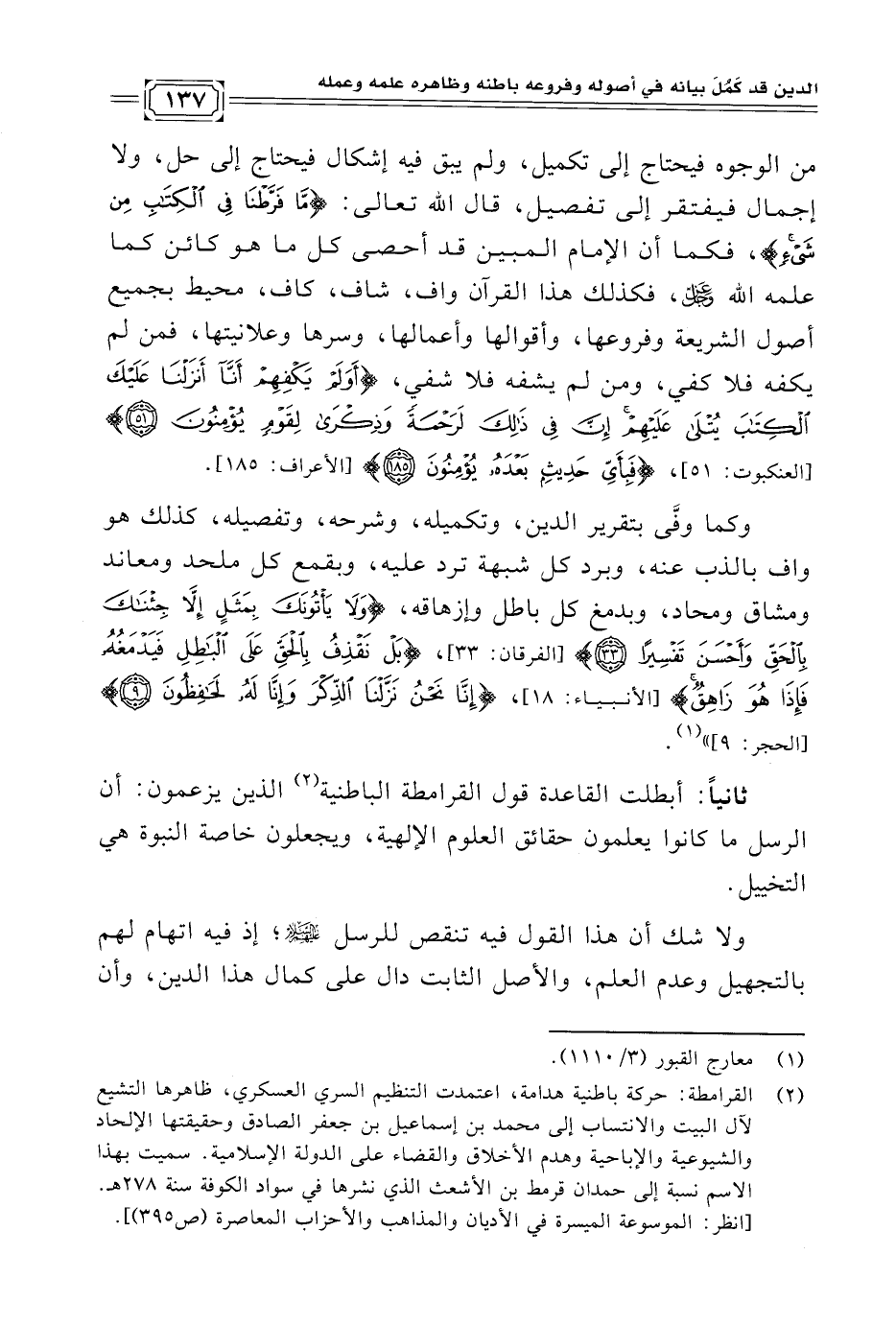 (¬٢) القرامطة: حركة باطنية هدامة، اعتمدت التنظيم السري العسكري، ظاهرها التشيع لآل البيت والانتساب إلى محمد بن إسماعيل بن جعفر الصادق وحقيقتها الإلحاد والشيوعية والإباحية وهدم الأخلاق والقضاء على الدولة الإسلامية. سميت بهذا الاسم نسبة إلى حمدان قرمط بن الأشعث الذي نشرها في سواد الكوفة سنة ٢٧٨ هـ. [انظر: الموسوعة الميسرة في الأديان والمذاهب والأحزاب المعاصرة (ص ٣٩٥)].