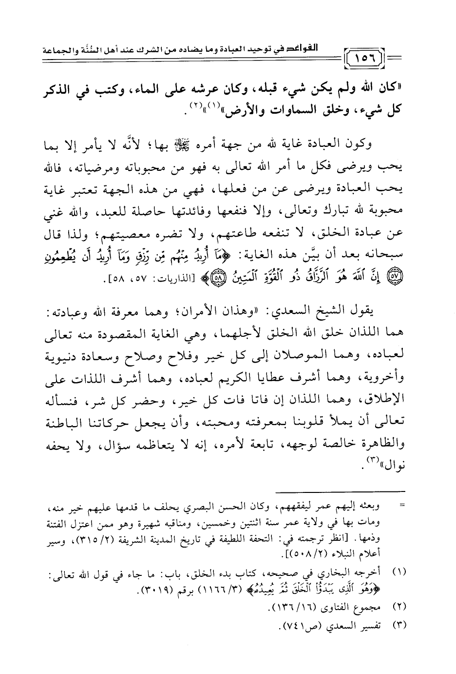 يقول الشيخ السعدي: "وهذان الأمران؛ وهما معرفة الله وعبادته: هما اللذان خلق الله الخلق لأجلهما، وهي الغاية المقصودة منه تعالى لعباده، وهما الموصلان إلى كل خير وفلاح وصلاح وسعادة دنيوية وأخروية، وهما أشرف عطايا الكريم لعباده، وهما أشرف اللذات على الإطلاق، وهما اللذان إن فاتا فات كل خير، وحضر كل شر، فنسأله تعالى أن يملأ قلوبنا بمعرفته ومحبته، وأن يجعل حركاتنا الباطنة والظاهرة خالصة لوجهه، تابعة لأمره، إنه لا يتعاظمه سؤال، ولا يحفه نوال" (¬٣).