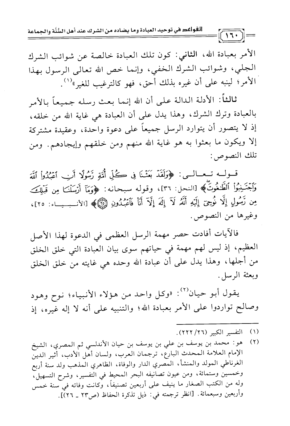 قوله تعالى: {وَلَقَدْ بَعَثْنَا فِي كُلِّ أُمَّةٍ رَسُولًا أَنِ اعْبُدُوا اللَّهَ وَاجْتَنِبُوا الطَّاغُوتَ} [النحل: ٣٦]، وقوله سبحانه: {وَمَا أَرْسَلْنَا مِنْ قَبْلِكَ مِنْ رَسُولٍ إِلَّا نُوحِي إِلَيْهِ أَنَّهُ لَا إِلَهَ إِلَّا أَنَا فَاعْبُدُونِ (٢٥)} [الأنبياء: ٢٥]، وغيرها من النصوص.