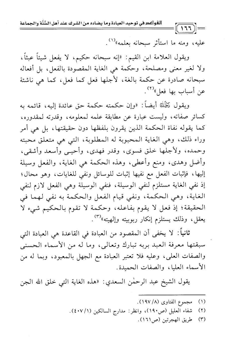 ويقول -رحمه الله- أيضًا: "وإن حكمته حكمة حق عائدة إليه، قائمه به كسائر صفاته، وليست عبارة عن مطابقة علمه لمعلومه، وقدرته لمقدوره، كما يقوله نفاة الحكمة الذين يقرون بلفظها دون حقيقتها، بل هي أمر وراء ذلك، وهي الغاية المحبوبة له المطلوبة، التي هي متعلق محبته وحمده، ولأجلها خلق فسوى، وقدر فهدى، وأحيى وأسعد وأشقى، وأضل وهدى، ومنع وأعطى، وهذه الحكمة هي الغاية، والفعل وسيلة إليها، فإثبات الفعل مع نفيها إثبات للوسائل ونفي للغايات، وهو محال؛ إذ نفي الغاية مستلزم لنفي الوسيلة، فنفي الوسيلة وهي الفعل لازم لنفي الغاية، وهي الحكمة، ونفي قيام الفعل والحكمة به نفي لهما في الحقيقة؛ إذ فعل لا يقوم بفاعله، وحكمة لا تقوم بالحكيم شيء لا يعقل، وذلك يستلزم إنكار ربوبيته وإلهيته" (¬٣).