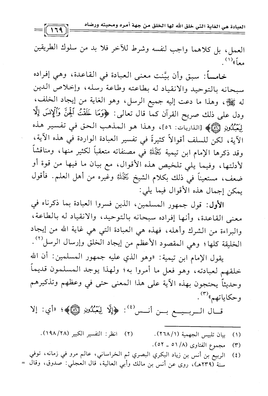 خامسًا: سبق وأن بيَّنت معنى العبادة في القاعدة، وهي إفراده سبحانه بالتوحيد والانقياد له بطاعته وطاعة رسله، وإخلاص الدين له -سبحانه وتعالي-، وهذا ما دعت إليه جميع الرسل، وهو الغاية من إيجاد الخلف، ودل على ذلك صريح القرآن كما قال تعالى: {وَمَا خَلَقْتُ الْجِنَّ وَالْإِنْسَ إِلَّا لِيَعْبُدُونِ (٥٦)} [الذاريات: ٥٦]، وهذا هو المذهب الحق في تفسير هذه الآية، لكن للسلف أقوالًا كثيرةً في تفسير العبادة الواردة في هذه الآية، وقد ذكرها الإمام ابن تيمية -رحمه الله- في مصنفاته متعقبًا لكثير منها، ومناقشًا لأدلتها، وفيما يلي تلخيص هذه الأقوال، مع بيان ما فيها من قوة أو ضعف، مستعينًا في ذلك بكلام الشيخ -رحمه الله- وغيره من أهل العلم. فأقول يمكن إجمال هذه الأقوال فيما يلي: