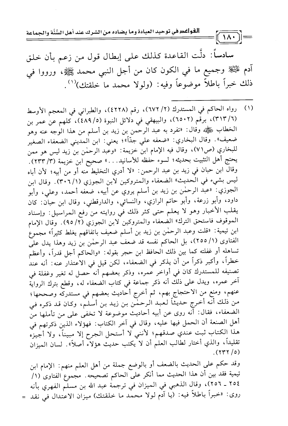 سادسًا: دلَّت القاعدة كذلك على إبطال قول من زعم بأن خلق آدم -عليه السلام- وجميع ما في الكون كان من أجل النبي محمد -صلى الله عليه وسلم-، ورووا في ذلك خبرًا باطلًا موضوعًا وفيه: (ولولا حمد ما خلقتك) (¬١).