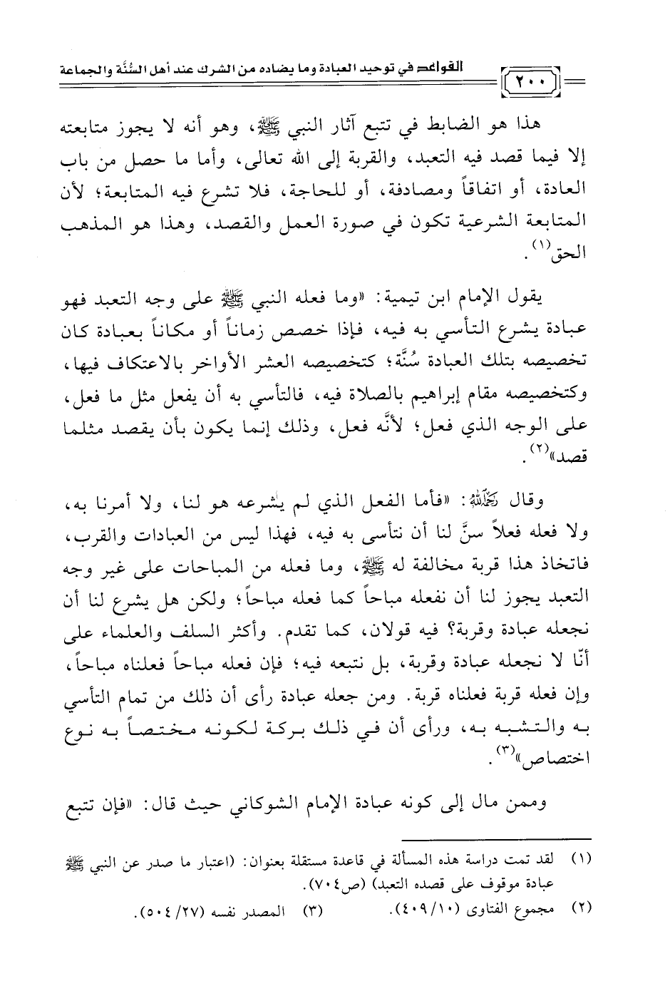 وقال -رحمه الله-: "فأما الفعل الذي لم يشرعه هو لنا، ولا أمرنا به، ولا فعله فعلًا سنَّ لنا أن نتأسى به فيه، فهذا ليس من العبادات والقرب، فاتخاذ هذا قربة مخالفة له -صلى الله عليه وسلم-، وما فعله من المباحات على غير وجه التعبد يجوز لنا أن نفعله مباحًا كما فعله مباحًا؛ ولكن هل يشرع لنا أن نجعله عبادة وقربة؟ فيه قولان، كما تقدم. وأكثر السلف والعلماء على أنّا لا نجعله عبادة وقربة، بل نتبعه فيه؛ فإن فعله مباحًا فعلناه مباحًا، وإن فعله قربة فعلناه قربة. ومن جعله عبادة رأى أن ذلك من تمام التأسي به والتشبه به، ورأى أن في ذلك بركة لكونه مختصًا به نوع اختصاص" (¬٣).