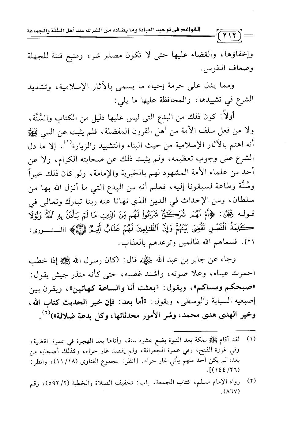 أولًا: كون ذلك من البدع التي ليس عليها دليل من الكتاب والسُّنَّة، ولا من فعل سلف الأمة من أهل القرون المفضلة، فلم يثبت عن النبي -صلى الله عليه وسلم- أنه اهتم بالآثار الإسلامية من حيث البناء والتشييد والزيارة (¬١)، إلا ما دل الشرع على وجوب تعظيمه، ولم يثبت ذلك عن صحابته الكرام، ولا عن أحد من علماء الأمة المشهود لهم بالخيرية والإمامة، ولو كان ذلك خيرًا وسُنَّة وطاعة لسبقونا إليه، فعلم أنه من البدع التي ما أنزل الله بها من سلطان، ومن الإحداث في الدين الذي نهانا عنه ربنا تبارك وتعالى في قوله -عز وجل-: {أَمْ لَهُمْ شُرَكَاءُ شَرَعُوا لَهُمْ مِنَ الدِّينِ مَا لَمْ يَأْذَنْ بِهِ اللَّهُ وَلَوْلَا كَلِمَةُ الْفَصْلِ لَقُضِيَ بَيْنَهُمْ وَإِنَّ الظَّالِمِينَ لَهُمْ عَذَابٌ أَلِيمٌ (٢١)} [الشورى: ٢١]. فسماهم الله ظالمين وتوعدهم بالعذاب.