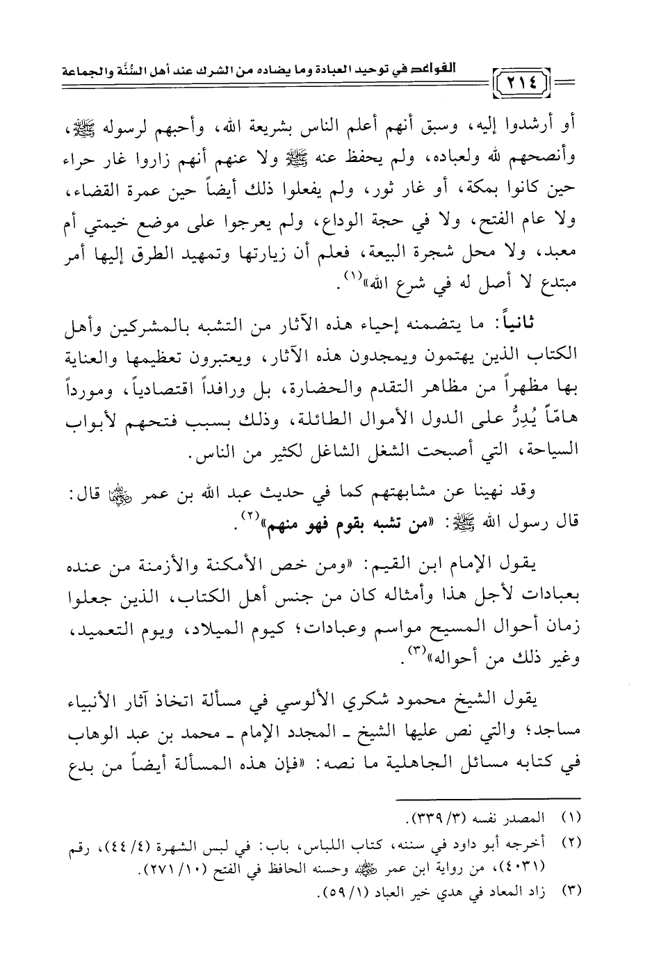 يقول الشيخ محمود شكري الألوسي في مسألة اتخاذ آثار الأنبياء مساجد؛ والتي نص عليها الشيخ -المجدد الإمام- محمد بن عبد الوهاب في كتابه مسائل الجاهلية ما نصه: "فإن هذه المسألة أيضًا من بدع