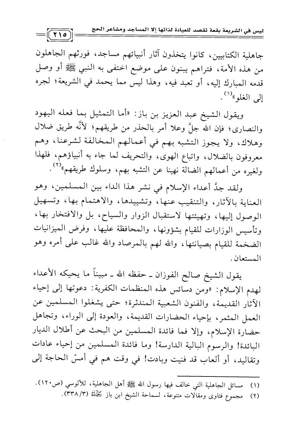 جاهلية الكتابيين، كانوا يتخذون آثار أنبيائهم مساجد، فورثهم الجاهلون من هذه الأمة، فتراهم يبنون على موضع اختفى به النبي -صلى الله عليه وسلم- أو وصل قدمه المبارك إليه، أو تعبد فيه، وهذا ليس مما يحمد في الشريعة؛ لجره إلى الغلو" (¬١).
