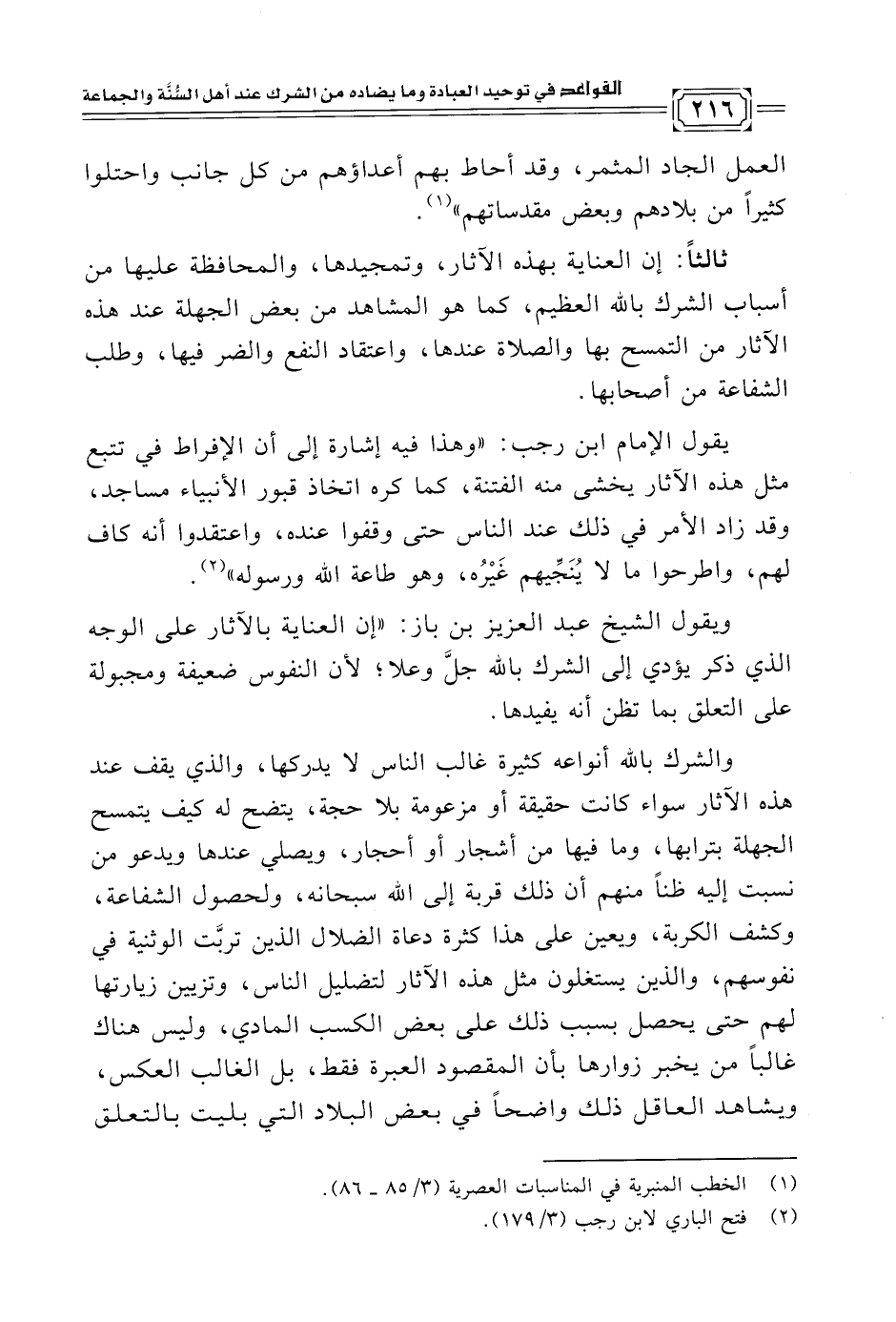 ويقول الشيخ عبد العزيز بن باز: "إن العناية بالآثار على الوجه الذي ذكر يؤدي إلى الشرك بالله جلَّ وعلا؛ لأن النفوس ضعيفة ومجبولة على التعلق بما تظن أنه يفيدها.