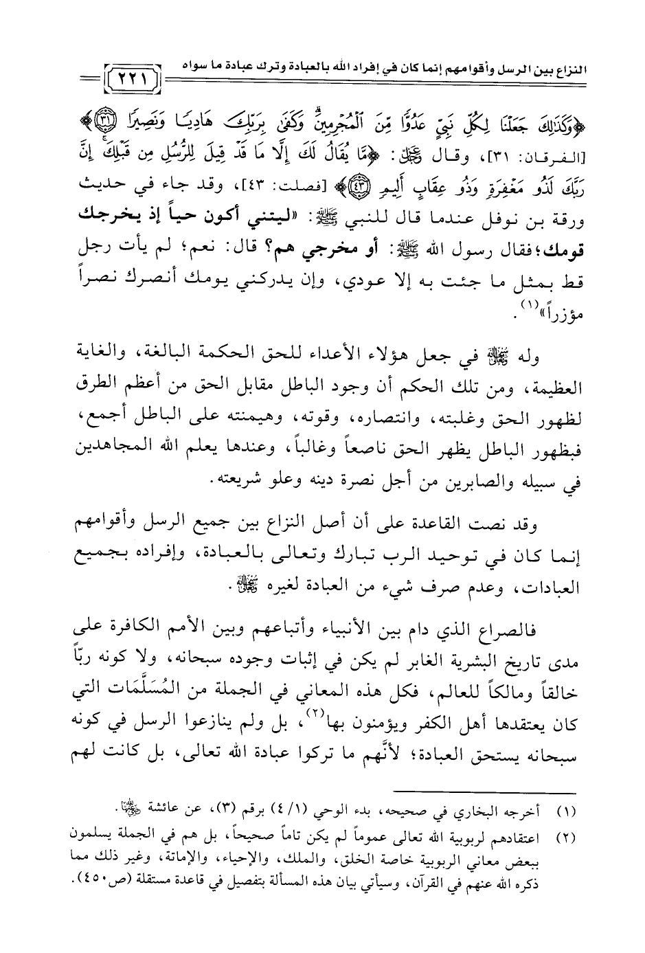وقد نصت القاعدة على أن أصل النزاع بين جميع الرسل وأقوامهم إنما كان في توحيد الرب تبارك وتعالى بالعبادة، وإفراده بجميع العبادات، وعدم صرف شيء من العبادة لغيره -سبحانه وتعالى-.