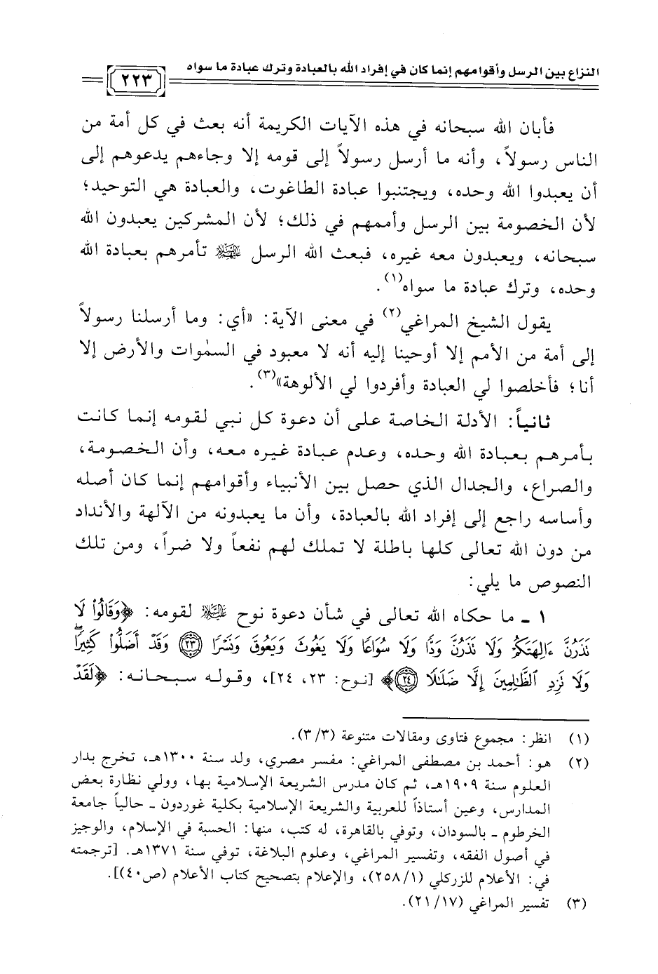 (¬٢) هو: أحمد بن مصطفى المراغي: مفسر مصري، ولد سنة ١٣٠٠ هـ، تخرج بدار العلوم سنة ١٩٠٩ هـ، ثم كان مدرس الشريعة الإسلامية بها، وولي نظارة بعض المدارس، وعين أستاذًا للعربية والشريعة الإسلامية بكلية غوردون -حاليًا جامعة الخرطوم- بالسودان، وتوفي بالقا هرة، له كتب، منها: الحسبة في الإسلام، والوجيز في أصول الفقه، وتفسير المراغي، وعلوم البلاغة، توفي سنة ١٣٧١ هـ. [ترجمته في: الأعلام للزركلي (١/ ٢٥٨)، والإعلام بتصحيح كتاب الأعلام (ص ٤٠)].