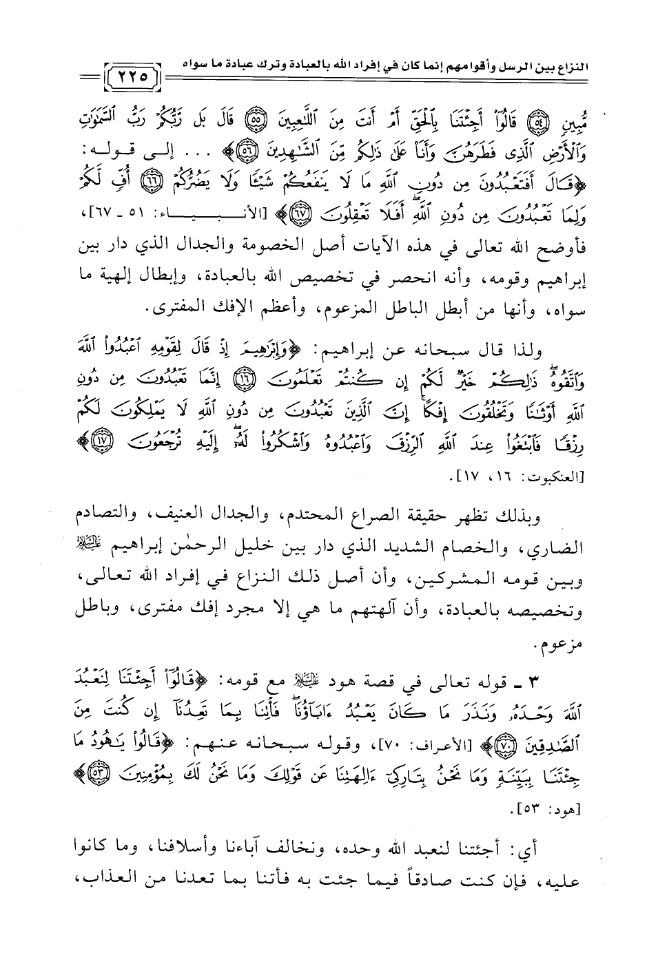 مُبِينٍ (٥٤) قَالُوا أَجِئْتَنَا بِالْحَقِّ أَمْ أَنْتَ مِنَ اللَّاعِبِينَ (٥٥) قَالَ بَلْ رَبُّكُمْ رَبُّ السَّمَاوَاتِ وَالْأَرْضِ الَّذِي فَطَرَهُنَّ وَأَنَا عَلَى ذَلِكُمْ مِنَ الشَّاهِدِينَ (٥٦) ... إلى قوله: {قَالَ أَفَتَعْبُدُونَ مِنْ دُونِ اللَّهِ مَا لَا يَنْفَعُكُمْ شَيْئًا وَلَا يَضُرُّكُمْ (٦٦) أُفٍّ لَكُمْ وَلِمَا تَعْبُدُونَ مِنْ دُونِ اللَّهِ أَفَلَا تَعْقِلُونَ (٦٧)} [الأنبياء: ٥١ - ٦٧]، فأوضح الله تعالى في هذه الآيات أصل الخصومة والجدال الذي دار بين إبراهيم وقومه، وأنه انحصر في تخصيص الله بالعبادة، وإبطال إلهية ما سواه، وأنها من أبطل الباطل المزعوم، وأعظم الإفك المفترى.