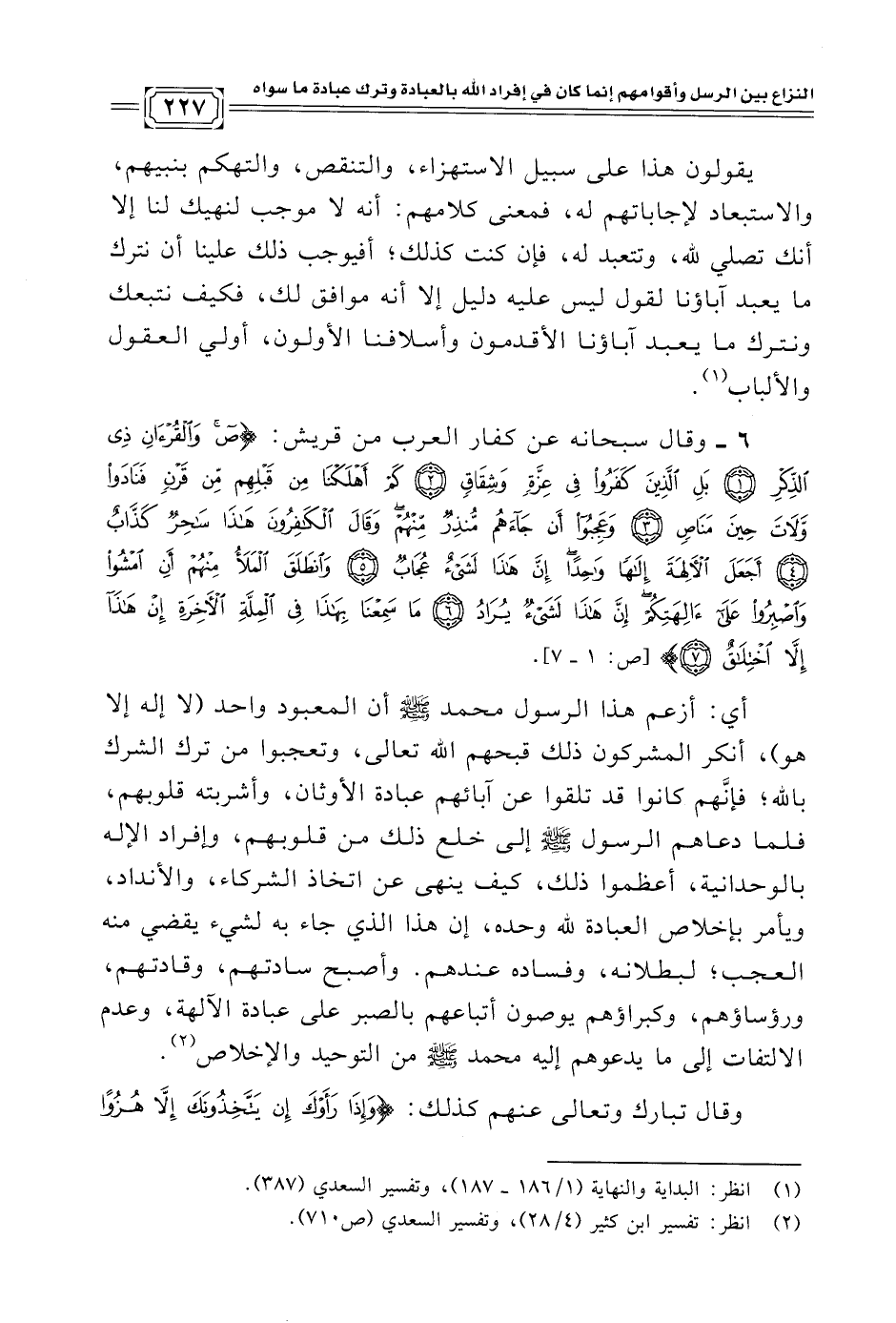 ٦ - وقال سبحانه عن كفار العرب من قريش: {ص وَالْقُرْآنِ ذِي الذِّكْرِ (١) بَلِ الَّذِينَ كَفَرُوا فِي عِزَّةٍ وَشِقَاقٍ (٢) كَمْ أَهْلَكْنَا مِنْ قَبْلِهِمْ مِنْ قَرْنٍ فَنَادَوْا وَلَاتَ حِينَ مَنَاصٍ (٣) وَعَجِبُوا أَنْ جَاءَهُمْ مُنْذِرٌ مِنْهُمْ وَقَالَ الْكَافِرُونَ هَذَا سَاحِرٌ كَذَّابٌ (٤) أَجَعَلَ الْآلِهَةَ إِلَهًا وَاحِدًا إِنَّ هَذَا لَشَيْءٌ عُجَابٌ (٥) وَانْطَلَقَ الْمَلَأُ مِنْهُمْ أَنِ امْشُوا وَاصْبِرُوا عَلَى آلِهَتِكُمْ إِنَّ هَذَا لَشَيْءٌ يُرَادُ (٦) مَا سَمِعْنَا بِهَذَا فِي الْمِلَّةِ الْآخِرَةِ إِنْ هَذَا إِلَّا اخْتِلَاقٌ (٧)} [ص: ١ - ٧].