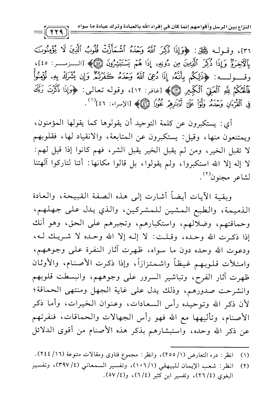 ٣٦]، وقوله - عز وجل -: {وَإِذَا ذُكِرَ اللَّهُ وَحْدَهُ اشْمَأَزَّتْ قُلُوبُ الَّذِينَ لَا يُؤْمِنُونَ بِالْآخِرَةِ وَإِذَا ذُكِرَ الَّذِينَ مِنْ دُونِهِ إِذَا هُمْ يَسْتَبْشِرُونَ (٤٥)} [الزمر: ٤٥]، وقوله: {ذَلِكُمْ بِأَنَّهُ إِذَا دُعِيَ اللَّهُ وَحْدَهُ كَفَرْتُمْ وَإِنْ يُشْرَكْ بِهِ تُؤْمِنُوا فَالْحُكْمُ لِلَّهِ الْعَلِيِّ الْكَبِيرِ (١٢)} [غافر: ١٢]، وقوله تعالى: {وَإِذَا ذَكَرْتَ رَبَّكَ فِي الْقُرْآنِ وَحْدَهُ وَلَّوْا عَلَى أَدْبَارِهِمْ نُفُورًا (٤٦)} [الإسراء: ٤٦] (¬١).