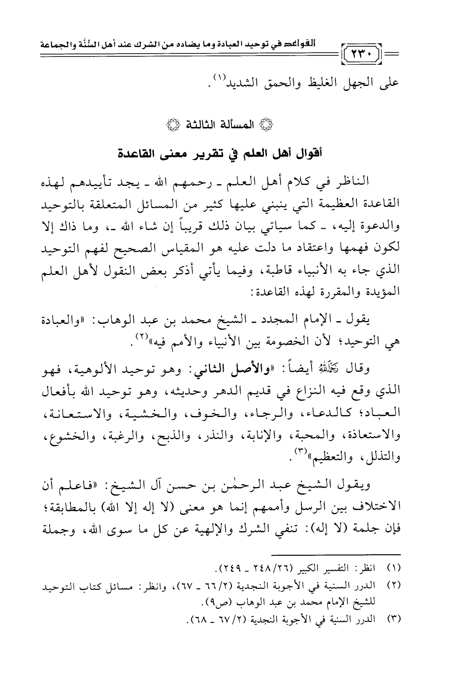 (¬٢) الدرر السنية في الأجوبة النجدية (٢/ ٦٦ - ٦٧)، وانظر: مسائل كتاب التوحيد للشيخ الإمام محمد بن عبد الوهاب (ص ٩).