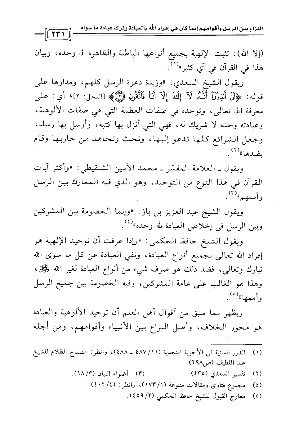 ويقول الشيخ عبد العزيز بن باز: "وإنما الخصومة بين المشركين وبين الرسل في إخلاص العبادة لله وحده" (¬٤).