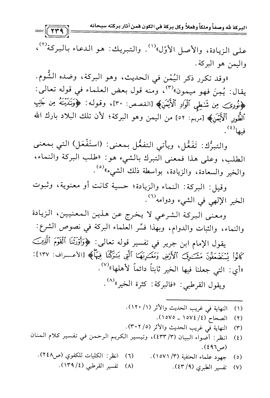 يقول الإمام ابن جرير في تفسير قوله تعالى: {وَأَوْرَثْنَا الْقَوْمَ الَّذِينَ كَانُوا يُسْتَضْعَفُونَ مَشَارِقَ الْأَرْضِ وَمَغَارِبَهَا الَّتِي بَارَكْنَا فِيهَا} [الأعراف: ١٣٧]: "أي: التي جعلنا فيها الخير ثابتًا دائمًا لأهلها" (¬٧).