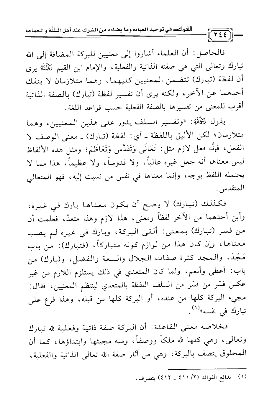 فالحاصل: أن العلماء أشاروا إلى معنيين للبركة المضافة إلى الله تبارك وتعالى التي هي صفته الذاتية والفعلية، والإمام ابن القيم رَحِمَهُ الله يرى أن لفظة (تبارك) تتضمن المعنيين كليهما، وهما متلازمان لا ينفك أحدهما عن الآخر، ولكنه يرى أن تفسير لفظة (تبارك) بالصفة الذاتية أقرب للمعنى من تفسيرها بالصفة الفعلية حسب قواعد اللغة.