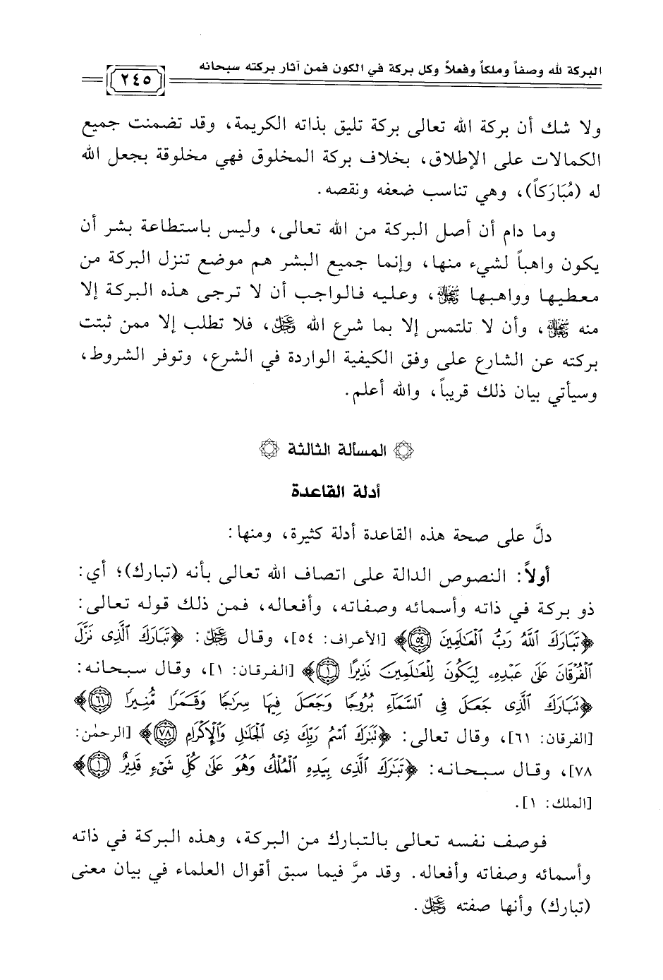 أولًا: النصوص الدالة على اتصاف الله تعالى بأنه (تبارك)؛ أي: ذو بركة في ذاته وأسمائه وصفاته، وأفعاله، فمن ذلك قوله تعالى: {تَبَارَكَ اللَّهُ رَبُّ الْعَالَمِينَ} [الأعراف: ٥٤]، وقال عزَّ وجلَّ: {تَبَارَكَ الَّذِي نَزَّلَ الْفُرْقَانَ عَلَى عَبْدِهِ لِيَكُونَ لِلْعَالَمِينَ نَذِيرًا (١)} [الفرقان: ١]، وقال سبحانه: {تَبَارَكَ الَّذِي جَعَلَ فِي السَّمَاءِ بُرُوجًا وَجَعَلَ فِيهَا سِرَاجًا وَقَمَرًا مُنِيرًا (٦١)} [الفرقان: ٦١]، وقال تعالى: {تَبَارَكَ اسْمُ رَبِّكَ ذِي الْجَلَالِ وَالْإِكْرَامِ (٧٨)} [الرحمن: ٧٨]، وقال سبحانه: {تَبَارَكَ الَّذِي بِيَدِهِ الْمُلْكُ وَهُوَ عَلَى كُلِّ شَيْءٍ قَدِيرٌ (١)} [الملك: ١].