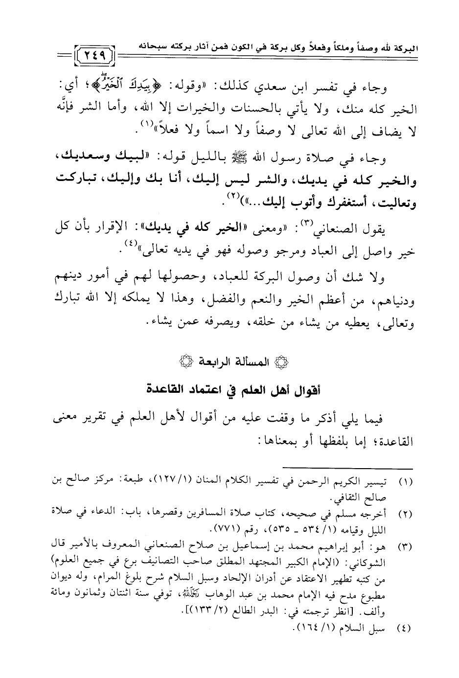 يقول الصنعاني (¬٣): "ومعنى "الخير كله في يديك": الإقرار بأن كل خير واصل إلى العباد ومرجو وصوله فهو في يديه تعالى" (¬٤).