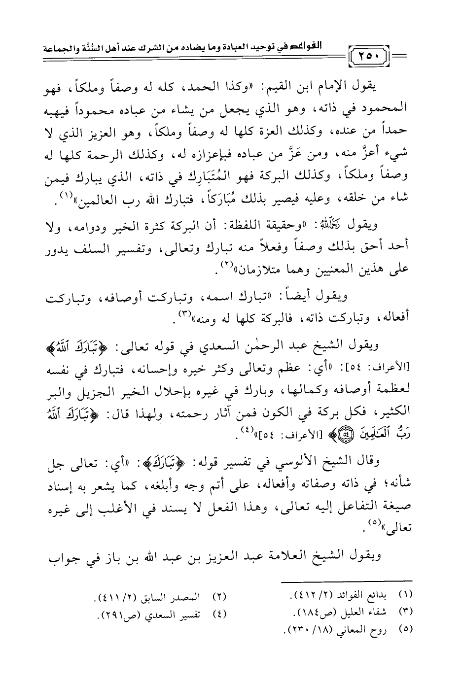 ويقول أيضًا: "تبارك اسمه، وتباركت أوصافه، وتباركت أفعاله، وتباركت ذاته، فالبركة كلها له ومنه" (¬٣).
