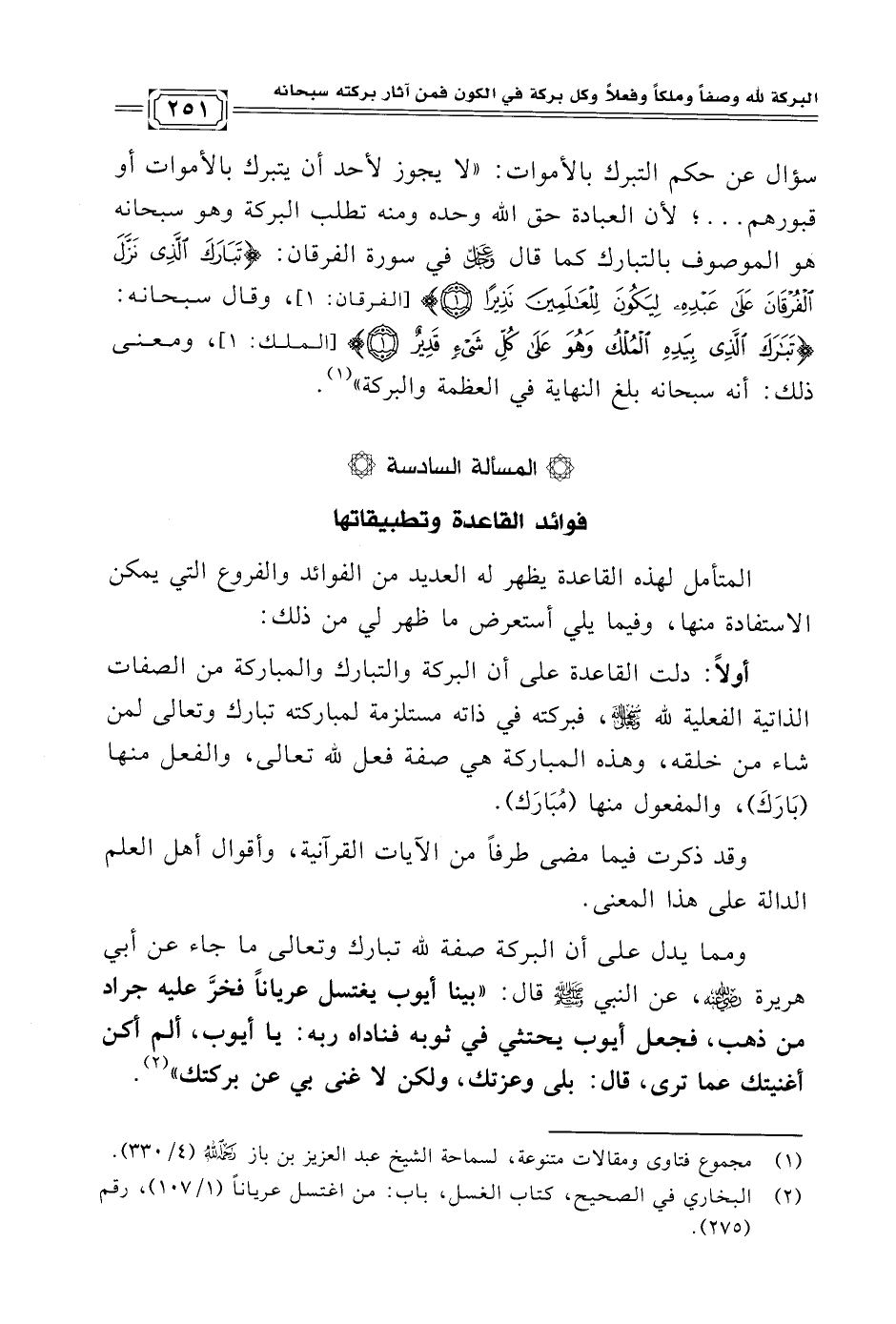 ومما يدل على أن البركة صفة لله تبارك وتعالى ما جاء عن أبي هريرة -رضي الله عنه-، عن النبي -صلى الله عليه وسلم- قال: "بينا أيوب يغتسل عريانًا فخرَّ عليه جراد من ذهب، فجعل أيوب يحتثي في ثوبه فناداه ربه: يا أيوب، ألم أكن أغنيتك عما ترى، قال: بلى وعزتك، ولكن لا غنى بي عن بركتك" (¬٢).
