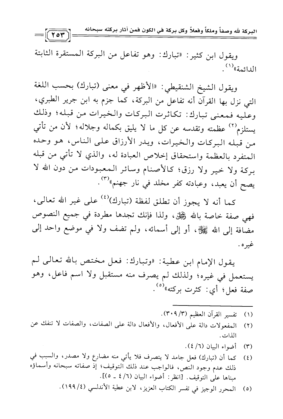 ويقول الشيخ الشنقيطي: "الأظهر في معنى (تبارك) بحسب اللغة التي نزل بها القرآن أنه تفاعل من البركة، كما جزم به ابن جرير الطبري، وعليه فمعنى تبارك: تكاثرت البركات والخيرات من قبله؛ وذلك يستلزم (¬٢) عظمته وتقدسه عن كل ما لا يليق بكماله وجلاله؛ لأن من تأتي من قبله البركات والخيرات، ويدر الأرزاق على الناس، هو وحده المتفرد بالعظمة واستحقاق إخلاص العبادة له، والذي لا تأتي من قبله بركة ولا خير ولا رزق؛ كالأصنام وسائر المعبودات من دون الله لا يصح أن يعبد، وعبادته كفر مخلد في نار جهنم" (¬٣).
