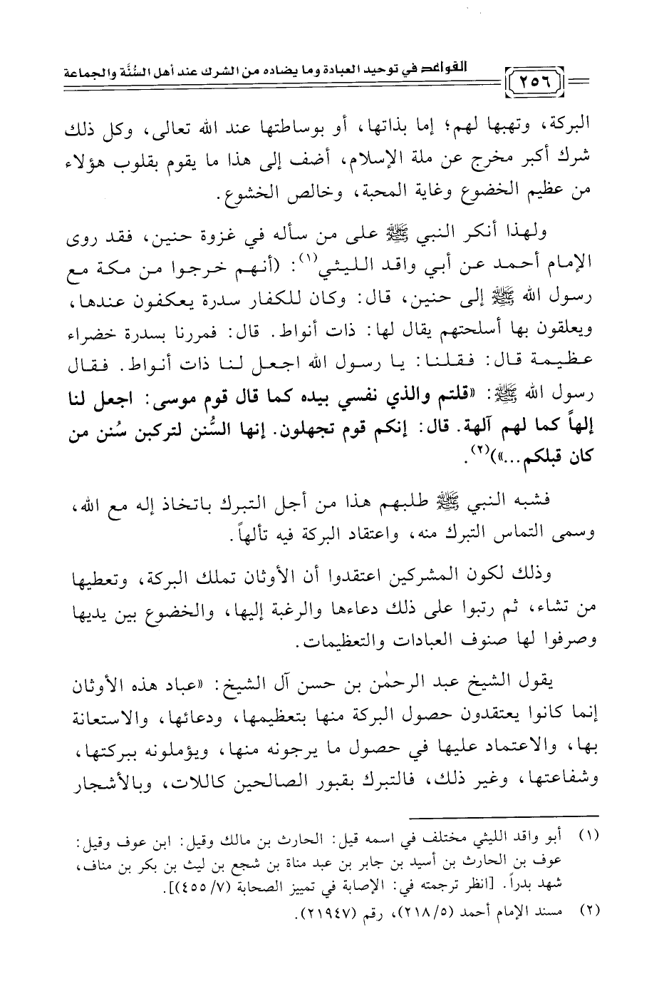 ولهذا أنكر النبي -صلى الله عليه وسلم- على من سأله في غزوة حنين، فقد روى الإمام أحمد عن أبي واقد الليثي (¬١): (أنهم خرجوا من مكة مع رسول الله -صلى الله عليه وسلم- إلى حنين، قال: وكان للكفار سدرة يعكفون عندها، ويعلقون بها أسلحتهم يقال لها: ذات أنواط. قال: فمررنا بسدرة خضراء عظيمة قال: فقلنا: يا رسول الله اجعل لنا ذات أنواط. فقال رسول الله -صلى الله عليه وسلم-: "قلتم والذي نفسي بيده كما قال قوم موسى: اجعل لنا إلهًا كما لهم آلهة. قال: إنكم قوم تجهلون. إنها السُّنن لتركبن سُنن من كان قبلكم ... " (¬٢).