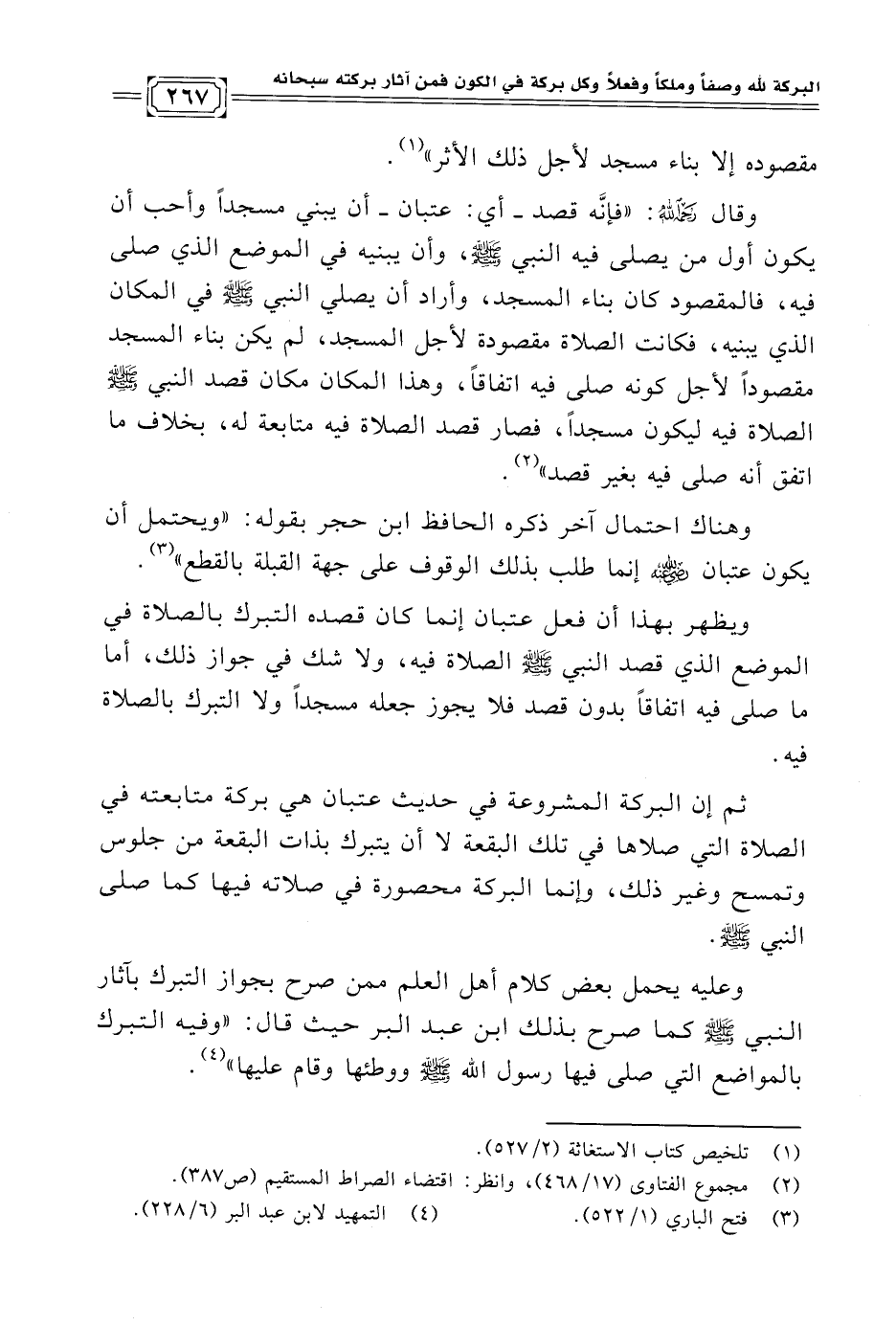 وعليه يحمل بعض كلام أهل العلم ممن صرح بجواز التبرك بآثار النبي -صلى الله عليه وسلم- كما صرح بذلك ابن عبد البر حيث قال: "وفيه التبرك بالمواضع التي صلى فيها رسول الله -صلى الله عليه وسلم- ووطئها وقام عليها" (¬٤).