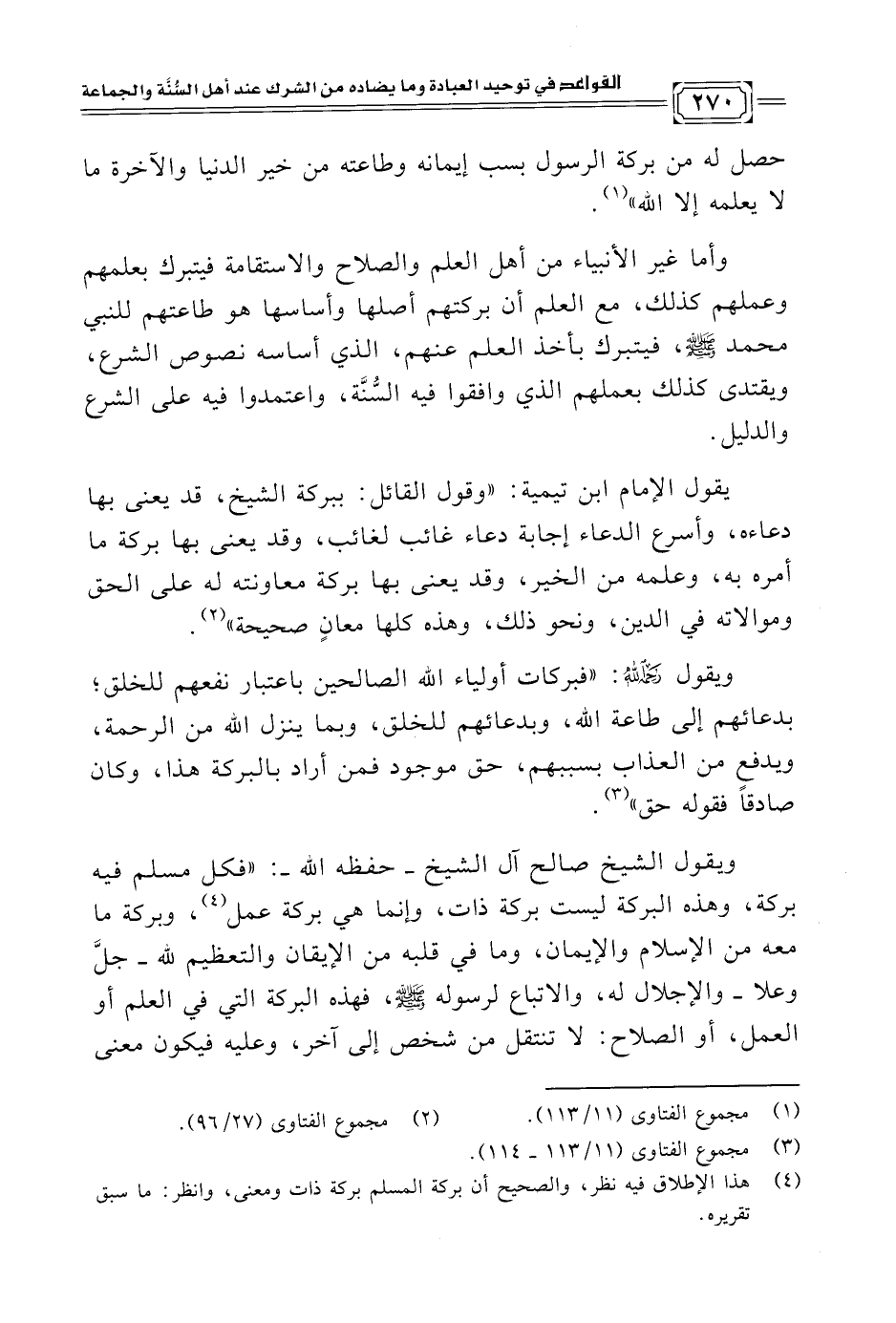 ويقول رَحِمَهُ الله: "فبركات أولياء الله الصالحين باعتبار نفعهم للخلق؛ بدعائهم إلى طاعة الله، وبدعائهم للخلق، وبما ينزل الله من الرحمة، ويدفعِ من العذاب بسببهم، حق موجود فمن أراد بالبركة هذا، وكان صادقًا فقوله حق" (¬٣).