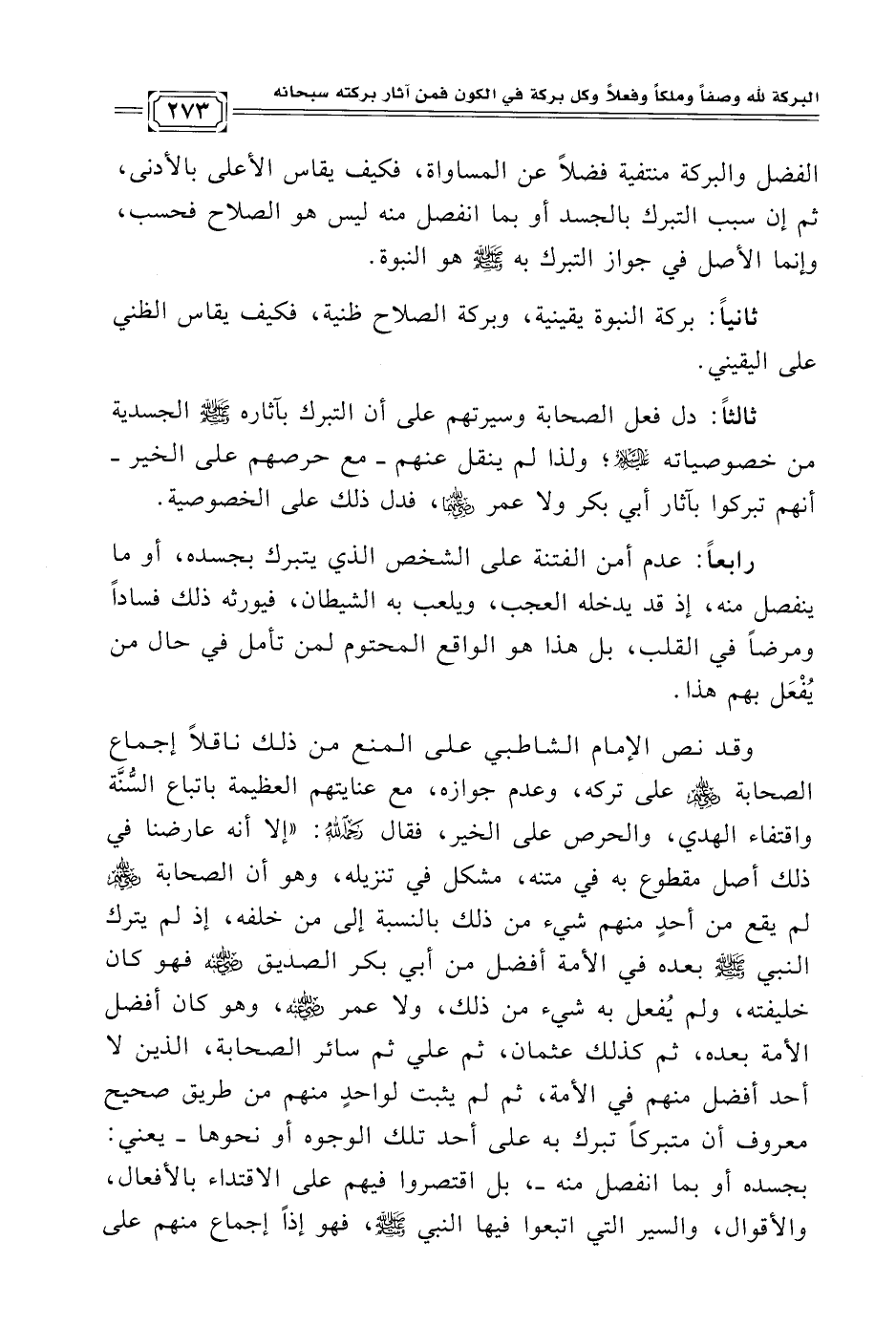 ثالثًا: دل فعل الصحابة وسيرتهم على أن التبرك بآثاره -صلى الله عليه وسلم- الجسدية من خصوصياته عليه السلام؛ ولذا لم ينقل عنهم -مع حرصهم على الخير- أنهم تبركوا بآثار أبي بكر ولا عمر -رضي الله عنهما -، فدل ذلك على الخصوصية.
